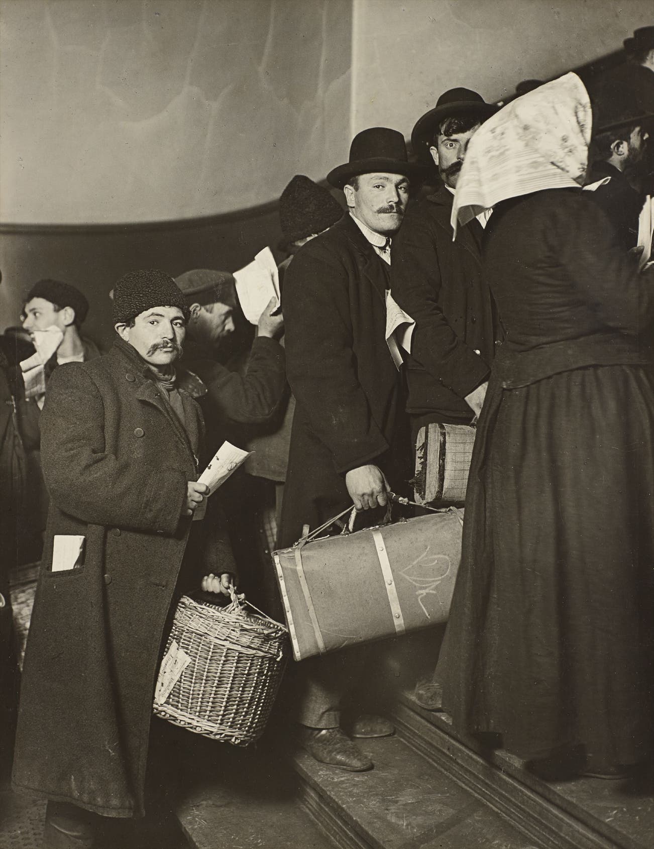 "Climbing into America. With 1905 equipment, it was not possible (for this photographer at least) to show the herding and mechanization of the final once-over these future citizens received on the 'assembly line' made necessary by the fact that so many thousands were admitted daily."