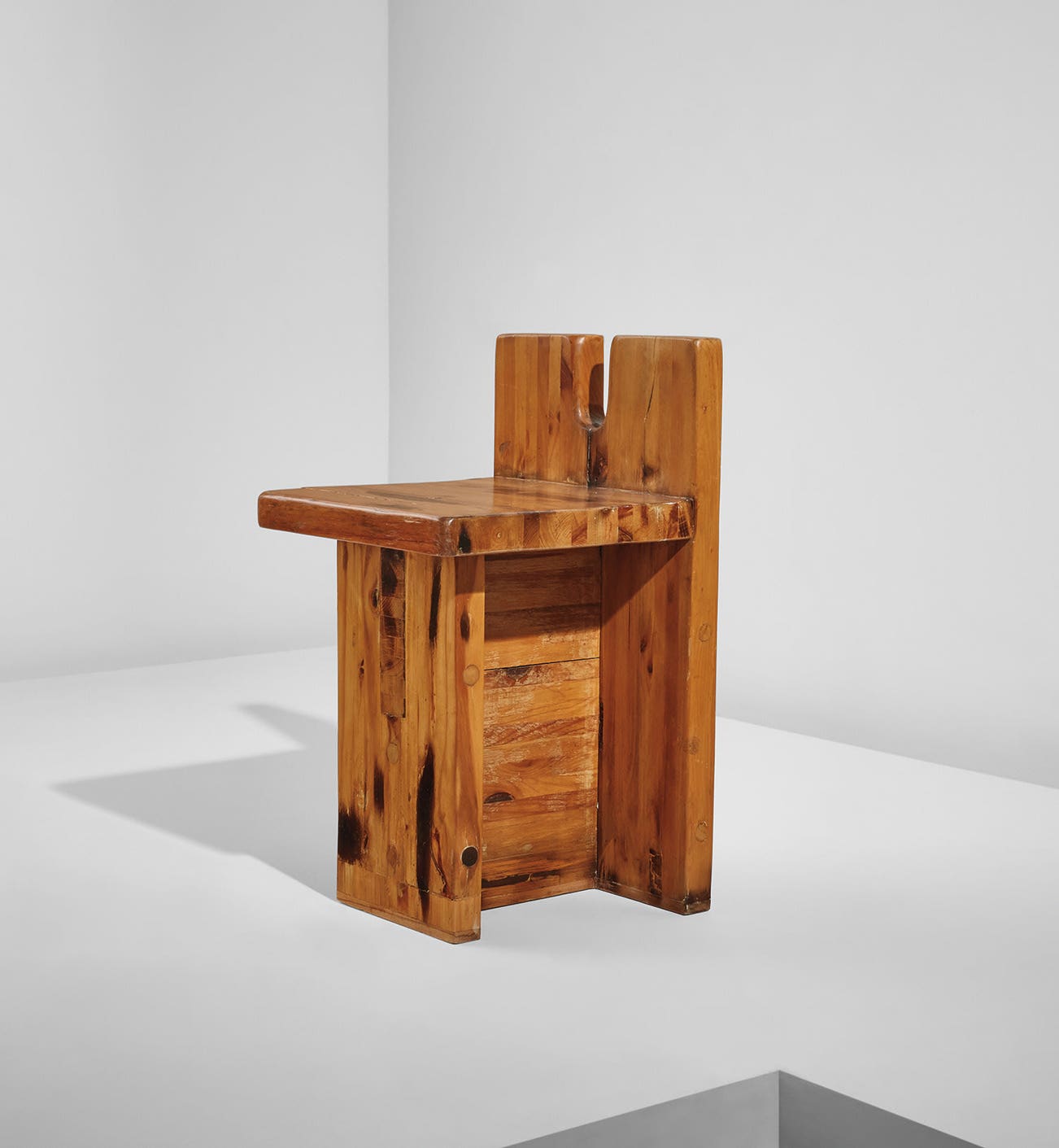Prolific architect and designer Lina Bo Bardi spent her working life primarily in Brazil, where her projects promoted architecture as an agent for integration between people and their city. Fittingly, Bardi was commissioned to design a center for the Serviço Social do Comércio (SESC) in Pompéia, a working-class district in São Paulo. The SESC is a non-profit private institution in Brazil that provides members with free or low-cost cultural and social activities. Designed and built between 1977 and 1986, Bardi and her collaborators retrofit an existing building that had been a tire factory with a sports complex, cafeteria, common spaces, and theater, among other amenities. Bardi wanted the complex to be accessible and enduring, favoring strong, low-maintenance materials such as the existing concrete structure and local woods, like the pine used to construct the present chair. This chair, along with the other examples made for the SESC Pompéia, was executed by the construction workers on site with Bardi’s supervision and assistance. A constant promoter of the social and cultural possibilities of design, Bardi said, “For me, architecture is seeing an elderly man or a child with a plate full of food elegantly crossing our restaurant looking for a place to sit at a collective table.” The present chair, which was once in the personal collection of Marcelo Ferraz, one of her co-collaborators on the SESC Pompéia project, embodies this sentiment through its simple, compact design, which allows one to move and place the chair with ease and strike up a conversation.