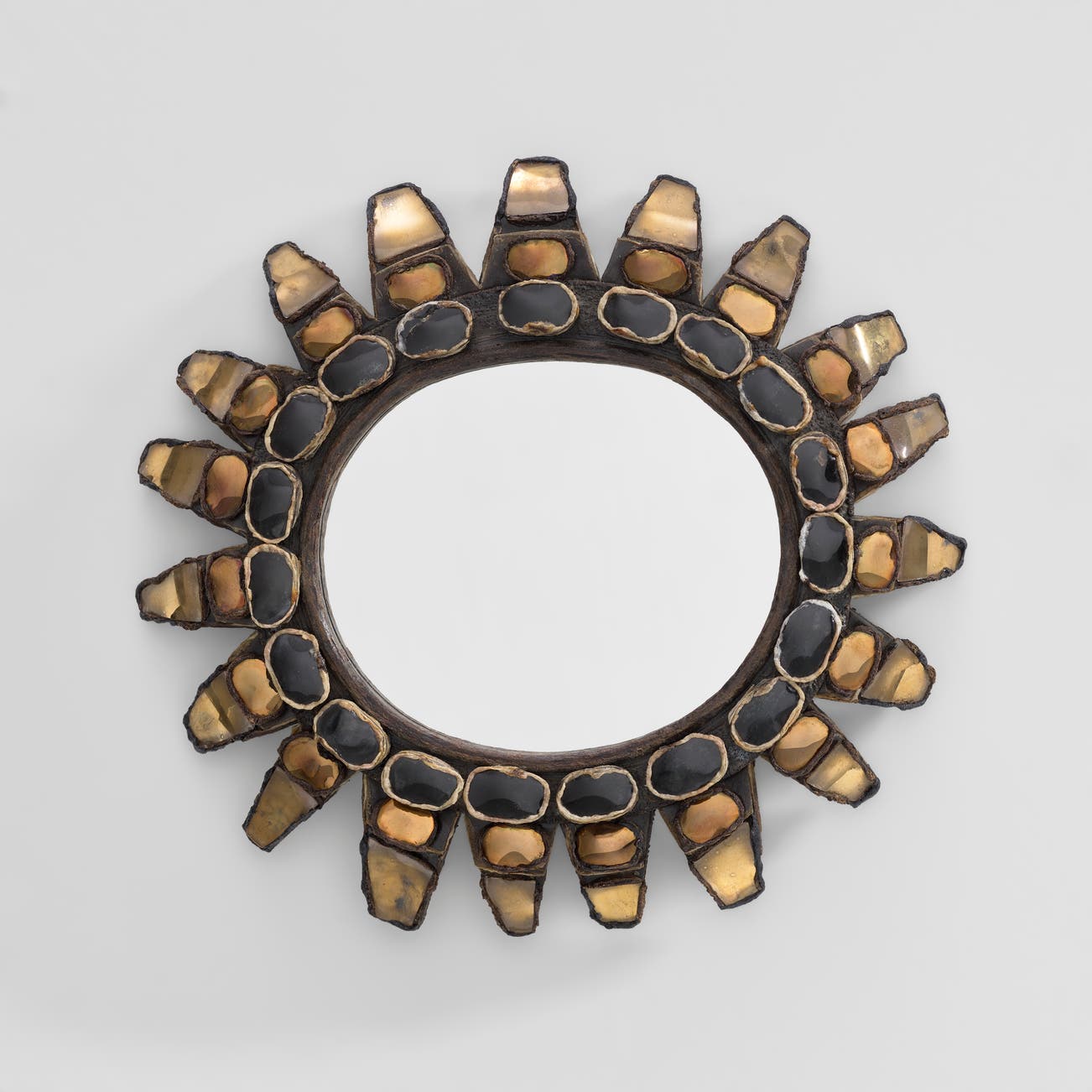 Eventually, however, she hit on her signature style, developing a material she coined talosel, which comprised layers of cellulose acetate that she carved, gouged, molded and encrusted with colored mirrored glass. This new material enabled her to expand her repertoire to include larger objects such as the mirrors for which she is best known today. The objects that she created in talosel are unlike any others — original, exuberant modern designs that, with the accretions and texture of the scarified talosel, carry the aura of ancient, time-worn relics. Vautrin credited the London art dealer David Gill with re-discovering her work at a 1986 auction of her property in Paris. Her work entered the collection of London's Victoria and Albert Museum, and since then has gained major traction in the twentieth-century design market.