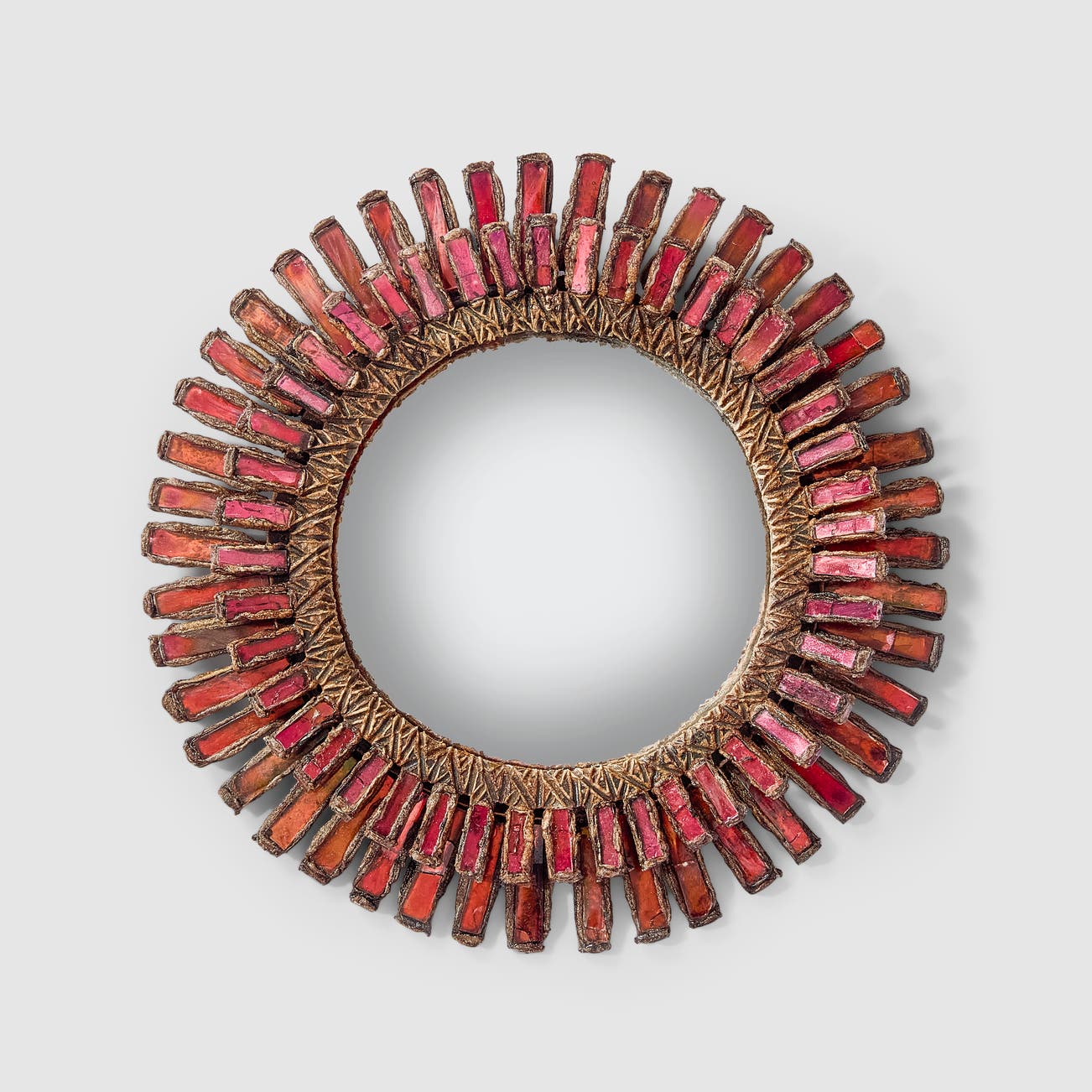 Eventually, however, she hit on her signature style, developing a material she coined talosel, which comprised layers of cellulose acetate that she carved, gouged, molded and encrusted with colored mirrored glass. This new material enabled her to expand her repertoire to include larger objects such as the mirrors for which she is best known today. The objects that she created in talosel are unlike any others — original, exuberant modern designs that, with the accretions and texture of the scarified talosel, carry the aura of ancient, time-worn relics. Vautrin credited the London art dealer David Gill with re-discovering her work at a 1986 auction of her property in Paris. Her work entered the collection of London's Victoria and Albert Museum, and since then has gained major traction in the twentieth-century design market.