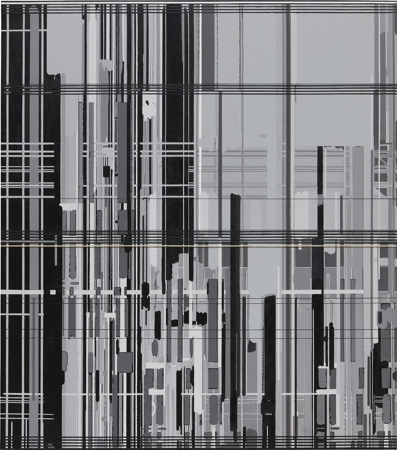 An abstract construction of monochrome grid-like patterns represents a modern Chinese city teeming with high-rise buildings—Colours No. 14 is a prime example from Liu Wei’s Colours series. The monochromatic scheme’s stillness forms a marked contrast to the exuberant colours used in the former series, Purple Air. Colours No. 14 through its horizontal bands and blocks of cool grey conveys a different perspective on Beijing’s intensive urbanisation. A cityscape constructed through layers of densely packed vertical and horizontal lines representing high rise buildings observed through a venetian blind allude to the recurring theme of architecture and urban life in Liu’s multifaceted practice. Liu explores this universal theme of humanity, utilising buildings and cities as the blueprint of human existence by investigating its environment and urbanisation in relation to society. This is an ultimate reflection and embodiment of Liu’s experience of living in that environment.