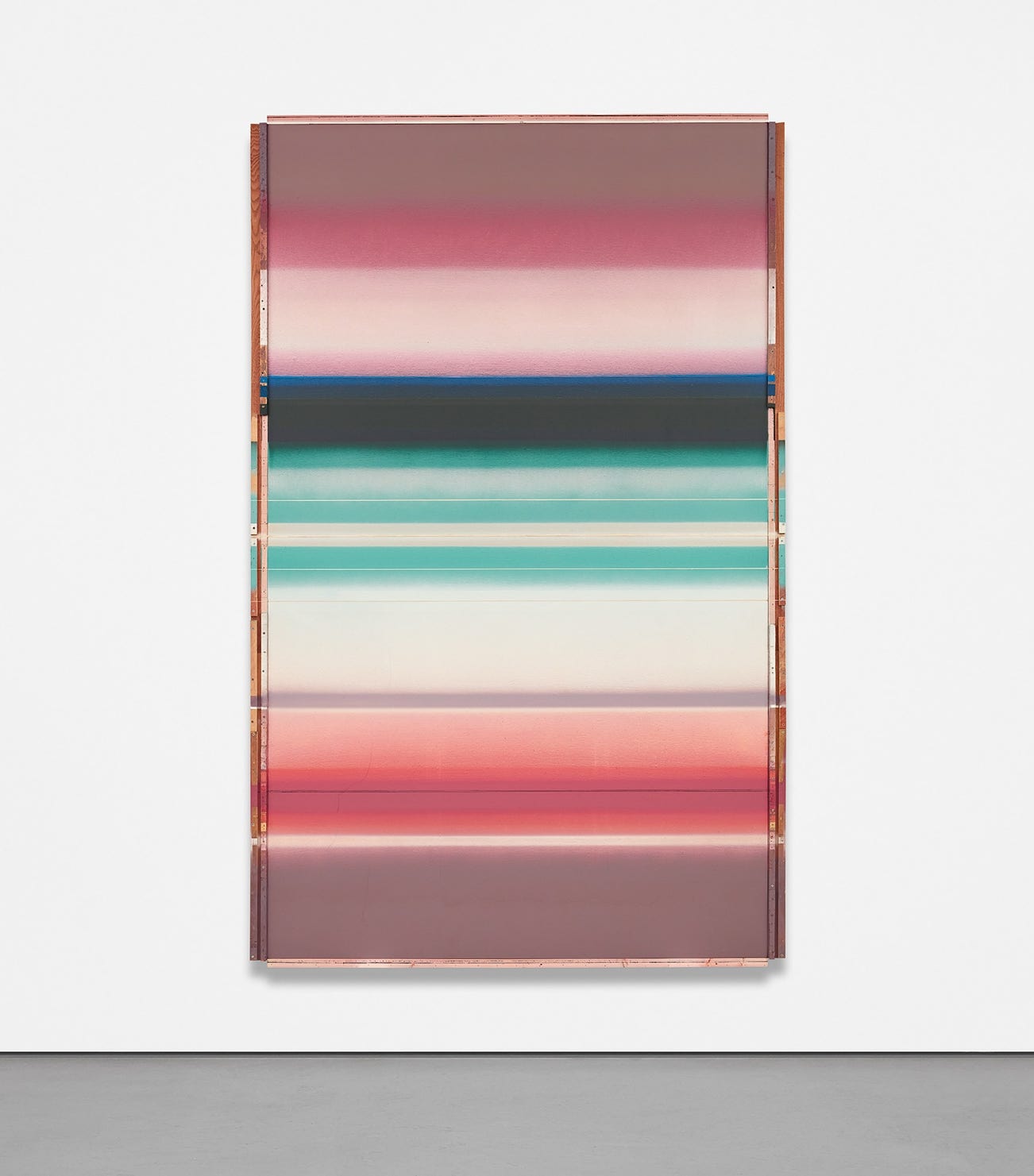 Prodigious in scale and composed of stacked chromatic hues, Beyond the Sky Limits is a prime example from Liu Wei’s practice that represents the Chinese visual contemporary artist’s move towards total abstraction. With an aesthetically pleasing balance between muted cool and warm tones of purple, blue, grey, orange and pink, the coloured strips blend into each other as they run the width of the canvas and extend onto the industrial wooden frame. Covering the work with luxurious, fluid brushstrokes, Liu Wei imbues the pictorial surface with a luminous dimensionality in which a unique ebb and flow unfolds, demonstrating the possibility of colour in a nonfigurative form. Whilst simple in composition, the artist’s horizontal bands of rich tones are all-encompassing, powerfully dictating the ambience of the artwork’s surroundings as Liu Wei draws upon the tenets of abstraction to transport the viewer into his contemplative painterly sphere.