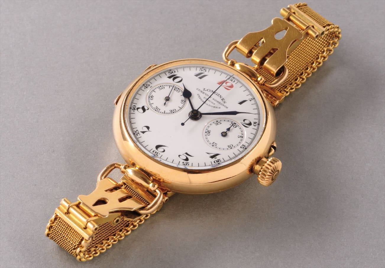 This example has many unusual features that can make the heart of the collector beat faster. First and foremost is the superb enamel dial with red ‘12’ hour marker, a carry-over from enamel dial pocket watches of the era. It further stands out with the highly desirable "Cuervo Y Sobrinos" retailer signature – the prestigious retailer in Havana, Cuba, founded in 1882. Unusually, the Longines name is printed in a semi-circular manner, something rarely done, but in this case to accommodate the retailer’s signature. Finally the early Gay Frères bracelet accompanying this watch is a study in workmanship style, with its wonderfully crafted mesh and flexible centerpiece that allows the bracelet to adjust to the size of the wearer’s wrist. Visually and technically enchanting, it’s a gorgeous example of an early Longines chronograph certain to please any vintage watch enthusiast.