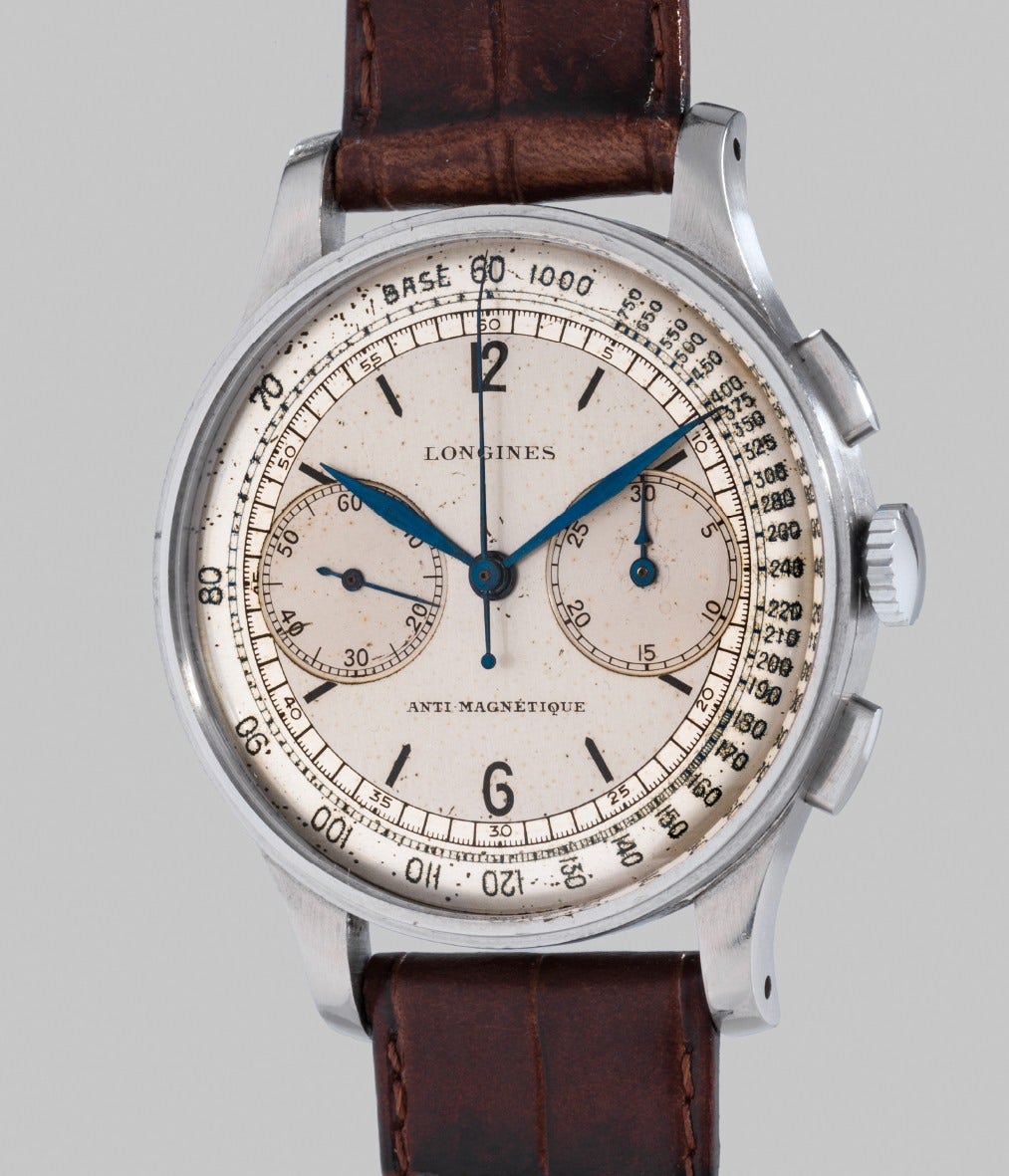 First launched in 1936, the Longines 13ZN chronograph movement is still considered today as one of the most beautiful and technically interesting wristwatch chronograph movements ever produced. The 13ZN was designed as a flyback chronograph, where a user can quickly reset the chronograph seconds hand to zero while it’s still running. Longines initially intended for these wristwatches to be used as tools for military personnel and aviators. Watches fitted with the caliber 13ZN were housed in cases ranging in size from 34mm to 38mm, and were produced with either snapback or screw-down casebacks.