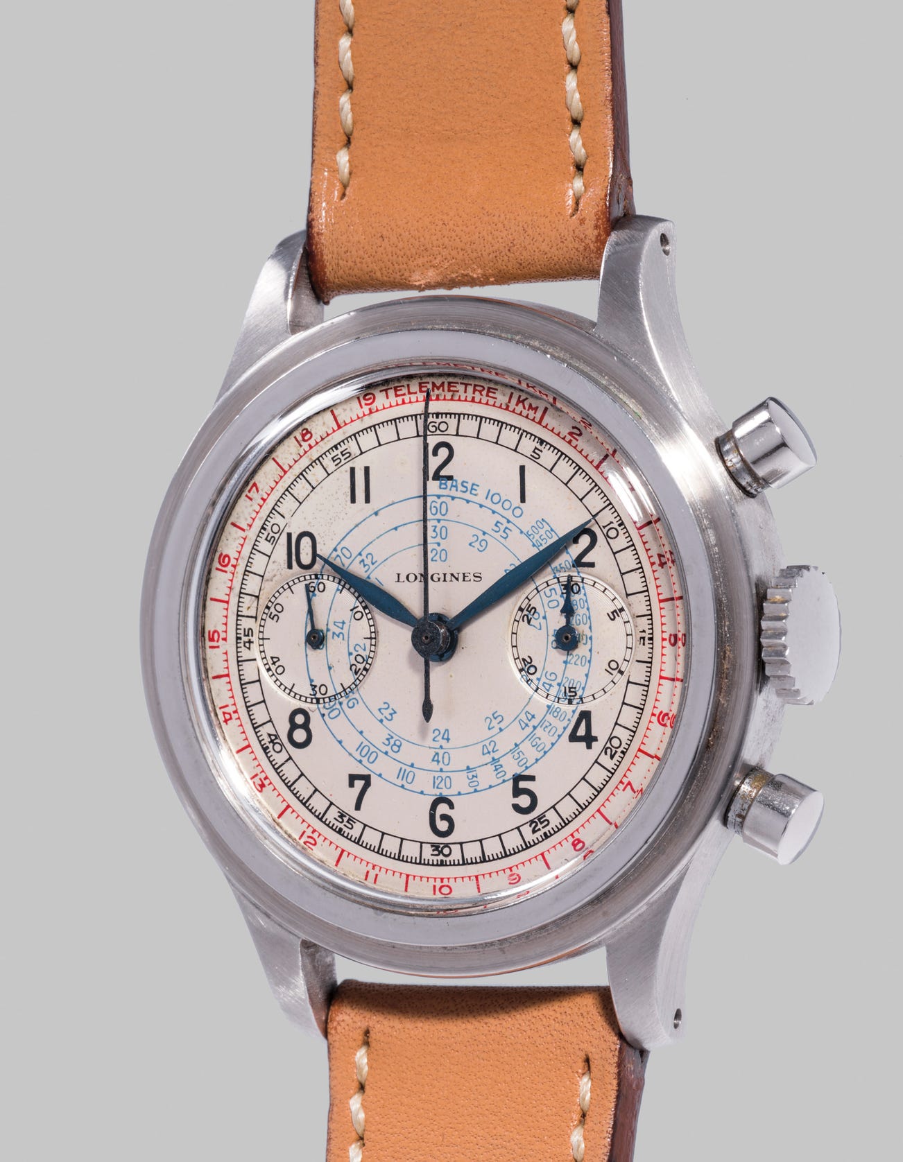 The present lot boasts a large 37.5mm stepped case and a lovely ivory colored multi scale dial. The screw-down casebacks, as found on the present lot, are highly desirable and nicknamed “tre tacche” in Italian. The literal translation in English is three notches, and refers to the three grooves carved out on the casebacks, permitting them to be screwed down. The caseback is stamped ‘28’ matching with the number found on the underside of the case’s lug.