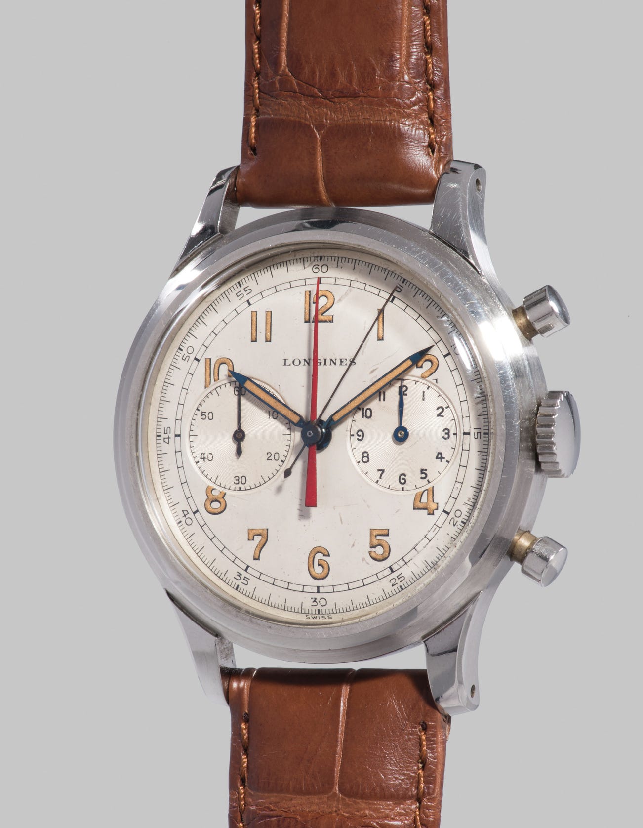 In 1936, Longines developed and patented what would become their most famous caliber: Caliber 13ZN. This chronograph movement was the most elaborate and was available in various versions, featuring a 30 or 60 minute counter and one or two pushers. The present reference 5699, bearing this prestigious caliber, displays a very specific feature. The watch features two central chronograph hands and is referred to amongst collector as the “Doppia Lancetta”, meaning two hands in English. These two centrally mounted hands not to be mistaken for a split seconds, serve to record the seconds and the minutes hence leading to the suppression of the minutes register. Produced for the American market, the movement of this watch is stamped with the Longines-Wittnauer import code: LXW. A noteworthy element to mention Longines’ specific numbering system where the case number was repeated on the upper left lugs, in this case 122. Reference 5699 further surprises by its considerable case size, measuring a dramatic 39.5mm in diameter. Rarely seen on the market, this “Doppia Lancetta” impresses not only by its size and presence but also represents tremendous value for the wise collector of vintage wristwatches.