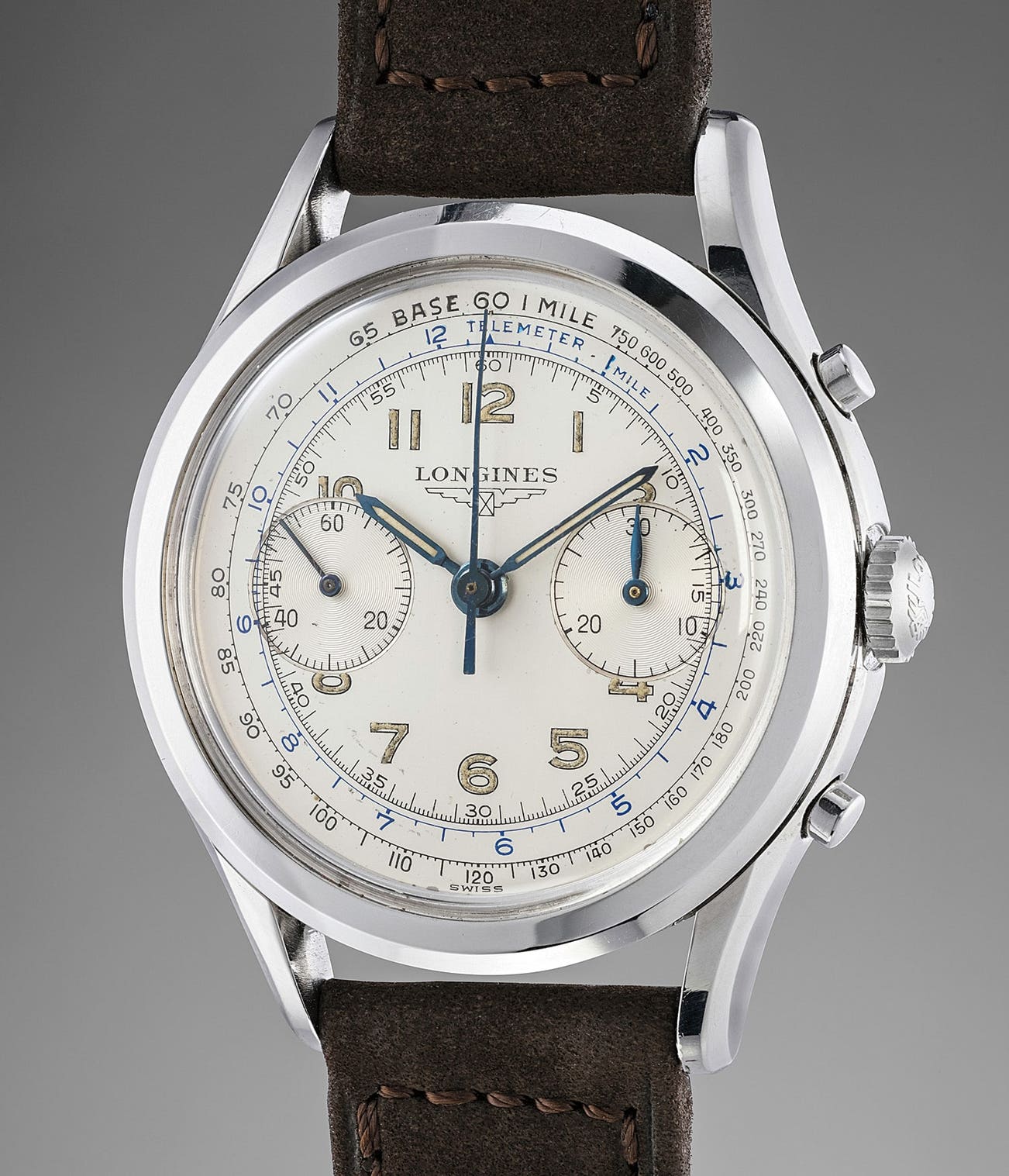 Offered in extremely attractive condition, the watch features a multi-scale dial with telemeter and tachymeter scales in addition to a fifth of a second baton combined with 5-minute Arabic divisions. The presence of the Certificate of Authenticity indicates that Longines examined and vetted the piece, adding further certainty to the originality of the watch. Highlighting the appeal and collectability of the piece, a similar example with a serial number 9 digits later than the present watch is described and illustrated in one of the most respected publications about Longines production and history, Longines Watches by John Goldberger.