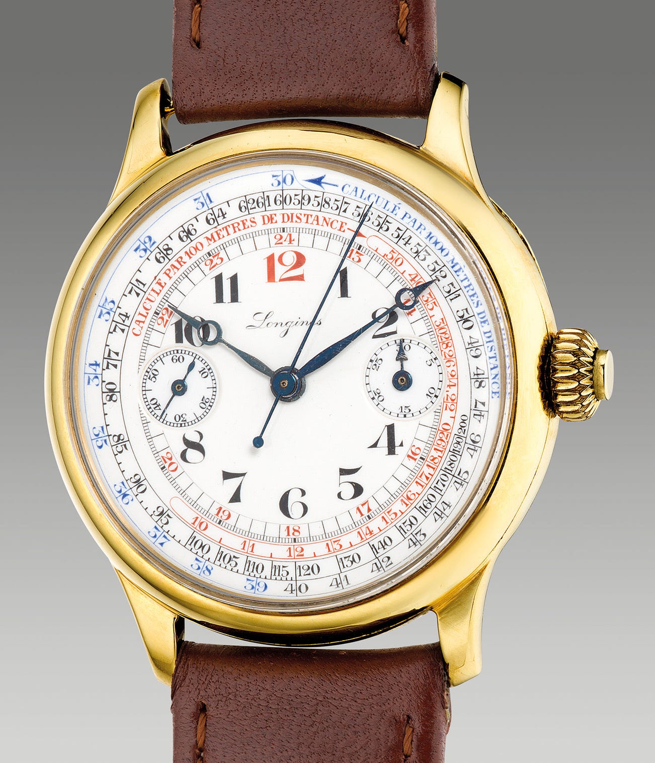 The example shown here is fitted with a beautiful enamel dial with red ‘12’ hour marker, a carry-over from enamel dial pocket watches of the era. The inscriptions on the dial are crisp and the fine yellow gold case will surely hit the heart of a seasoned collector looking at owning an early chronograph timepiece from Longines.