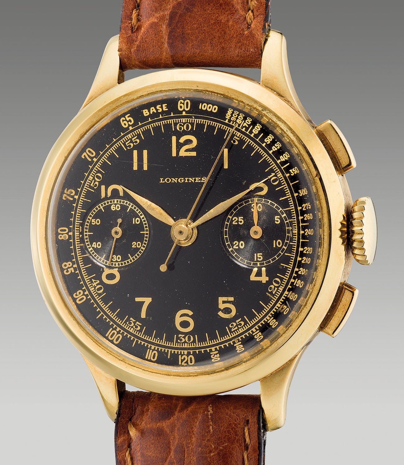 An attractive and rare yellow gold chronograph wristwatch with “glossy” black dial and tachymeter scale
