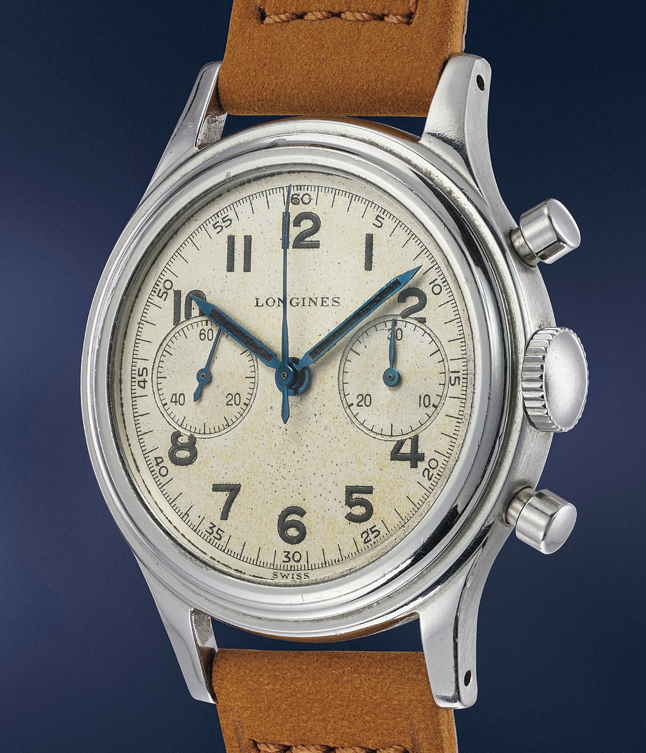 Mid-20th century Longines stainless steel chronograph wristwatches represent a remarkably collectible category of timepieces, both in virtue of their aesthetics, and of their technical proficiency as well. They are known both for their rugged masculine appeal and extraordinary caliber 13ZN movement. Introduced in 1936, the 13ZN was a large movement with flyback mechanism allowing the wearer to reset the watch without stopping it. This feature was particularly useful in aviation when dead reckoning flying was required. Watches from this period were offered in cases ranging from 34mm to 38mm, and with snap on backs like the present watch or screw down cases.
