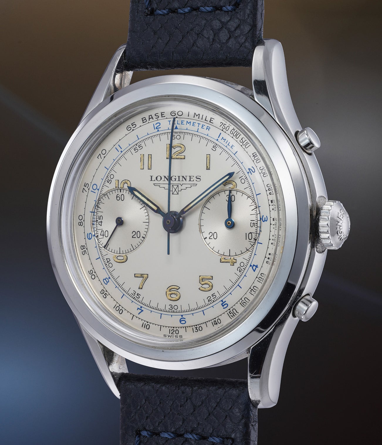 Preserved in impressive and absolutely excellent overall original condition, the untouched silvered dial features a black colored tachometer scale and blue colored telemeter scale along the outer circumference, further enhancing the beauty and desirability of this example. It should come as no surprise that this watch has been chosen by John Goldberger, legendary author and one of the world’s most renowned scholars, for his book Longines Watches.