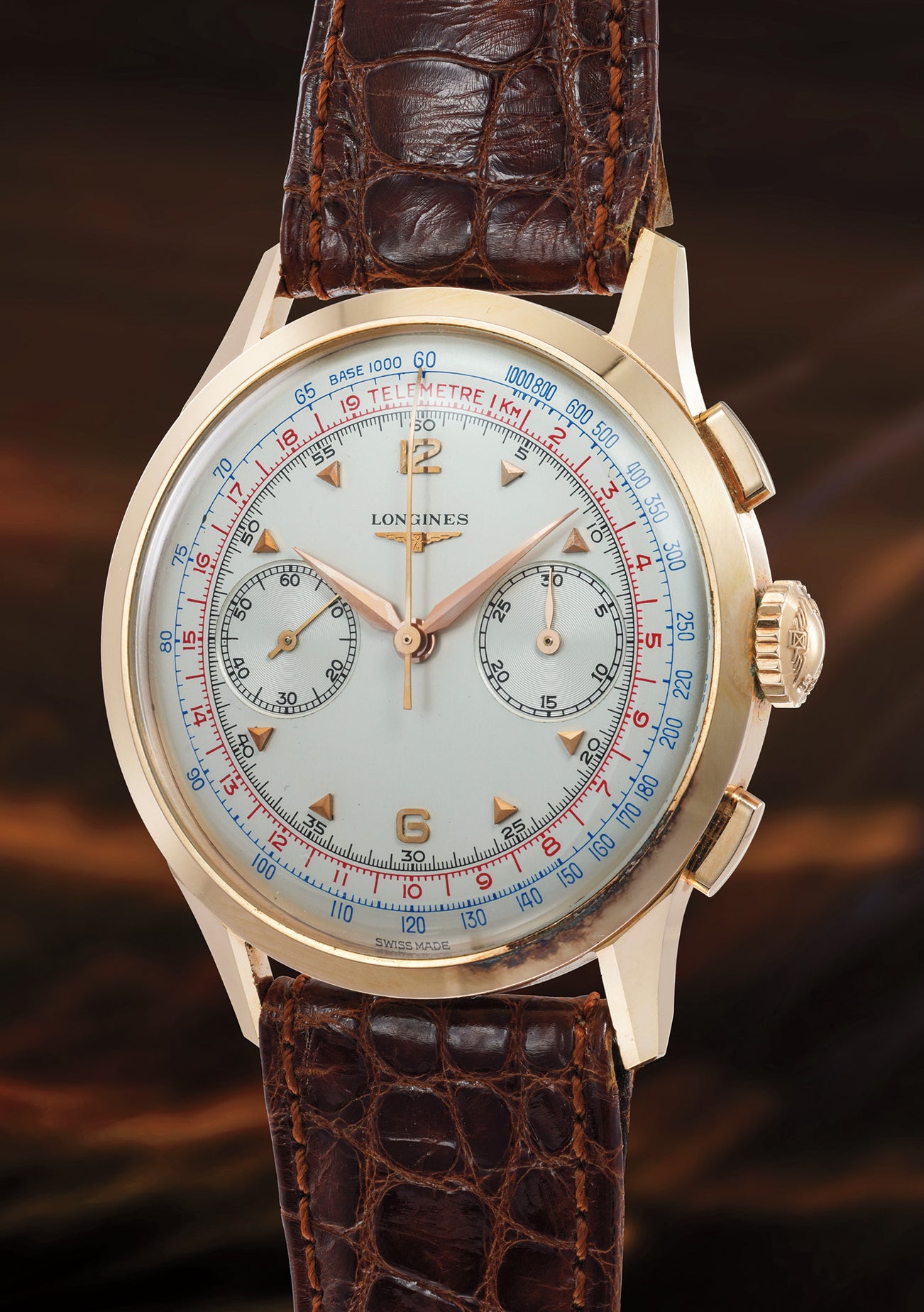 This exceptional pink gold chronograph wristwatch is a study on how a timepiece has slept in a safe for over half a century. It most notably boasts a case size of 38mm, which was unusually large for the period, when the norm was watch cases of 36mm or even less.