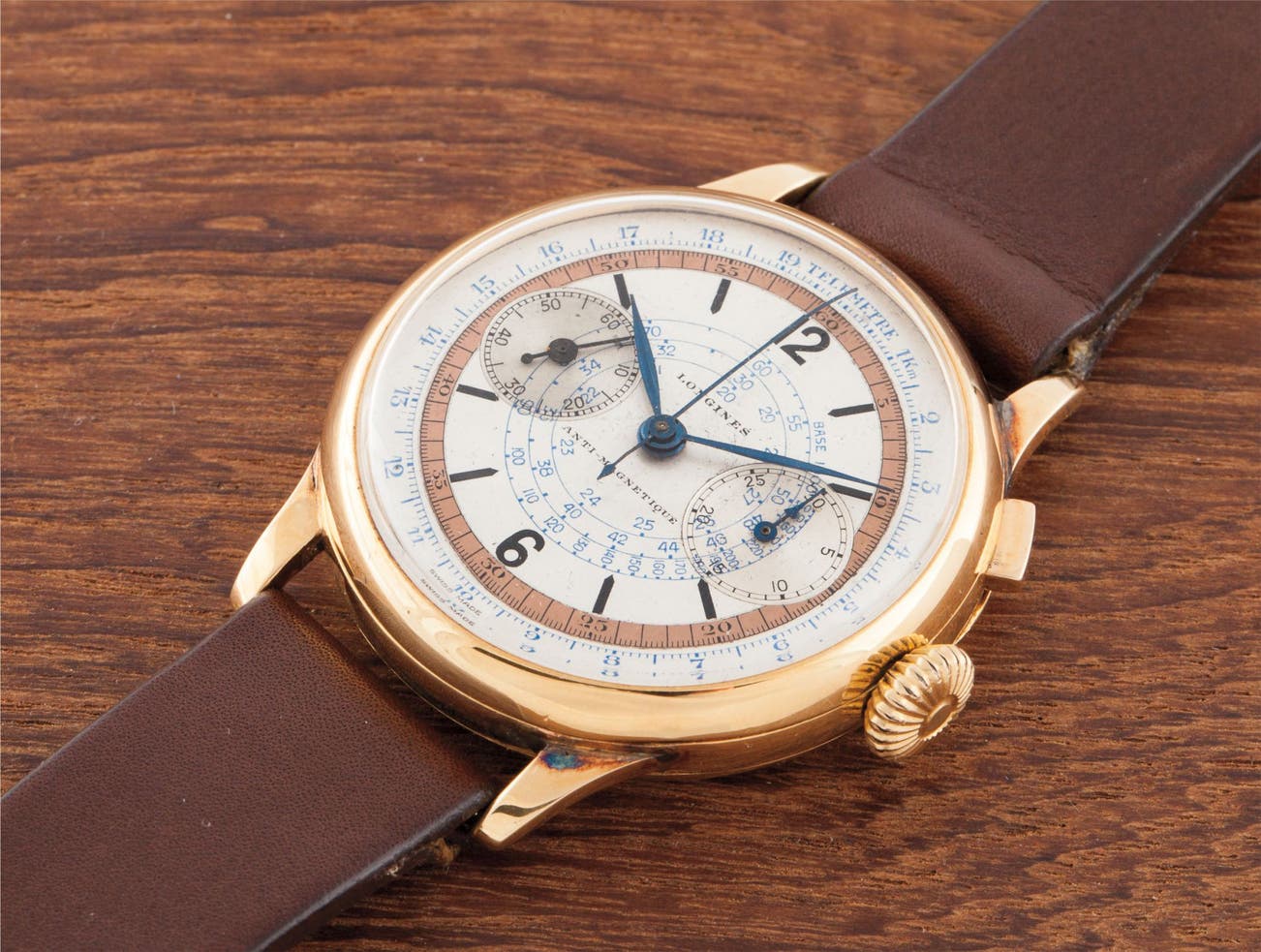 Chronographs by Longines are considered amongst the best made, most attractive and, consequently, collectable in the world. They stand out by an incredible level of sophistication in terms of design and unmatched movement finish. The present example is not only one of the largest known today but also one of the most attractive thanks to its silver and rose two-tone dial and the telemeter and the tachometer scales printed in blue. Originally sold to Italy in 1935 it is without a doubt one of the best looking wristwatches of the pre WWII period.