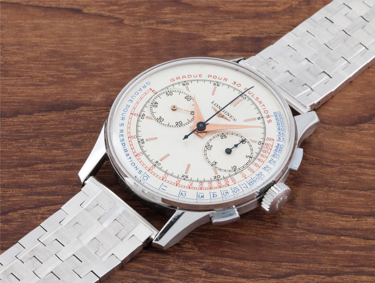 The present chronograph reference 5982 was most likely sold to South America given the SUIZA designation at the very bottom of the dial. Besides its close-to-mint and all original condition, this chronograph impresses with its multi scale medical dial, featuring not only a pulsation scale (in red) but also a respiration scale (in blue). It is fitted with Longines’ in-house calibre 530 and reaches its final destination most probably via a North American agent, in view of the typical LXW stamp on the movement.The most attractive polished and textured bracelet is most certainly from the same period and enhances the perfect vintage look of this attractive Longines Chronograph.