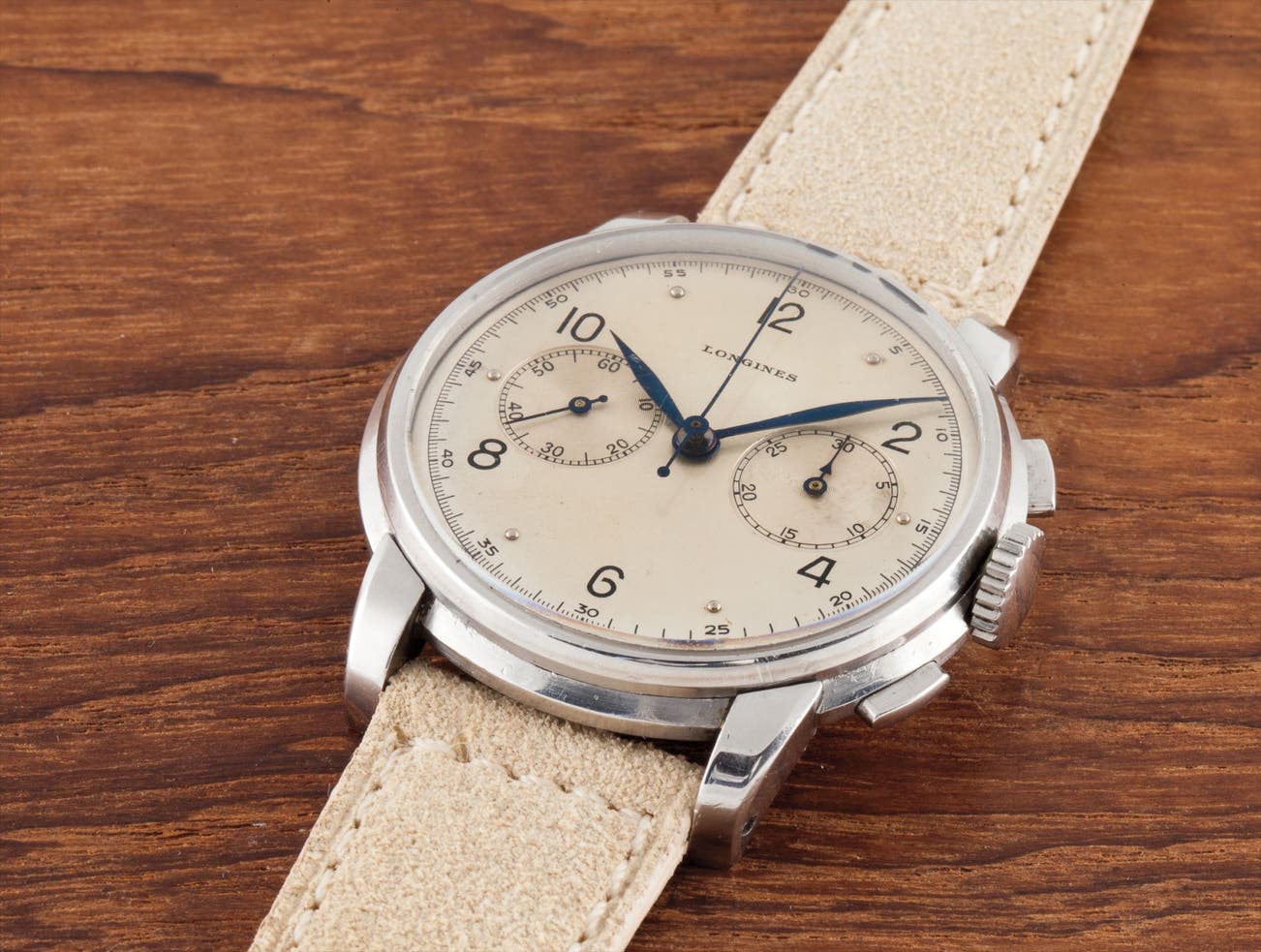 To many chronograph scholars and historians, Longines’ calibre 13ZN is one of the most beautiful chronograph movements ever built by any manufacturer. The present reference 23297 dates from 1940 and has been sold to Casa Welch, a famous retailer in Lima, Peru. This model is not only impressing with its large diameter but also with its refined case design featuring polished and satin finished elements. It is rare to find vintage wristwatches of ¾ century of age, offering such immense value when worn daily but also of such timeless design.