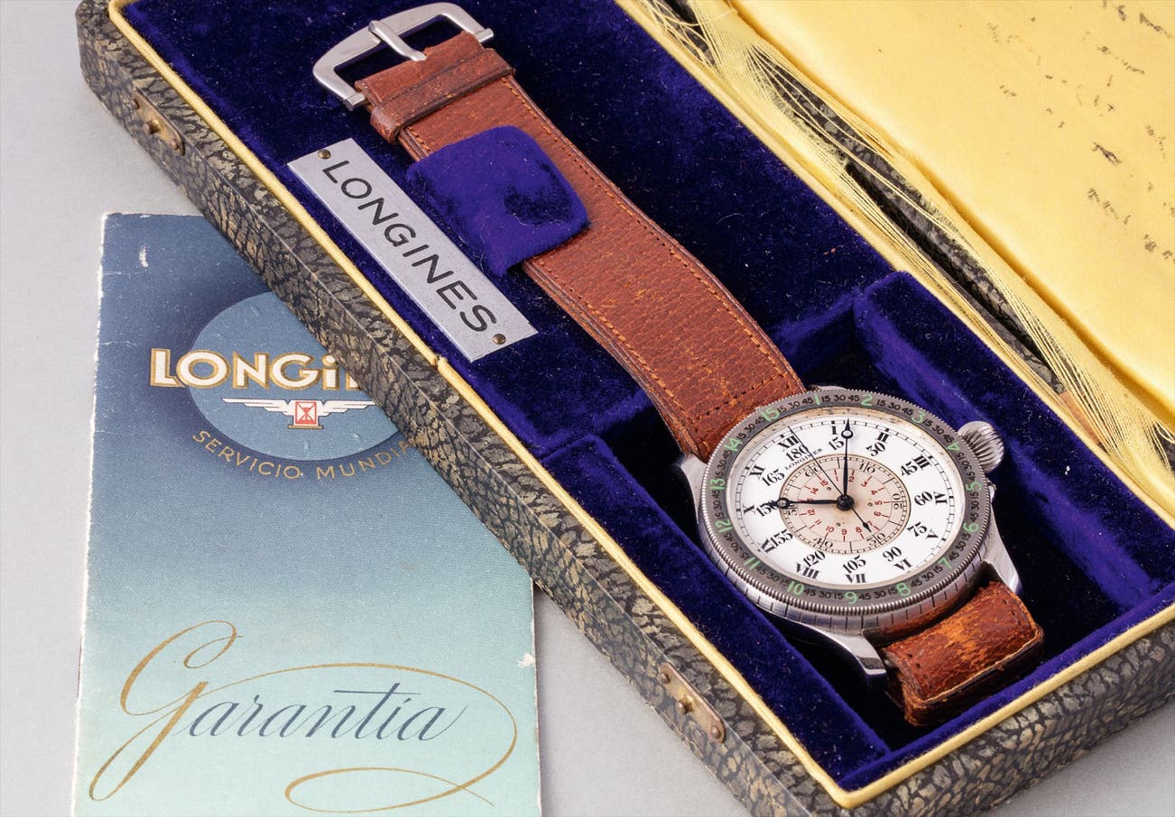 Sought after by collectors around the world, the present Longines Lindbergh Hour Angle is perhaps the best-preserved example to appear on the market in recent years. Not only in mint condition, the watch is absolutely complete, and is accompanied by its hardly ever seen original oversized box, original leather strap, and even its original buckle.