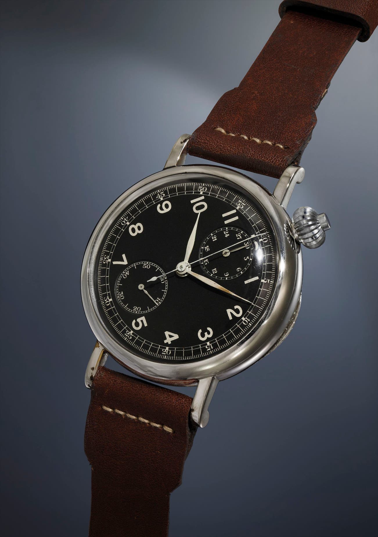 Type A-7 watches are immediately recognizable thanks to their unusual and unique, off-center dials. The single button pusher incorporated into the crown allowed pilot to easily start, stop and reset the chronograph to zero. With massive cases measuring 51 mm in diameter, they are true trophies for collectors of military timepieces.