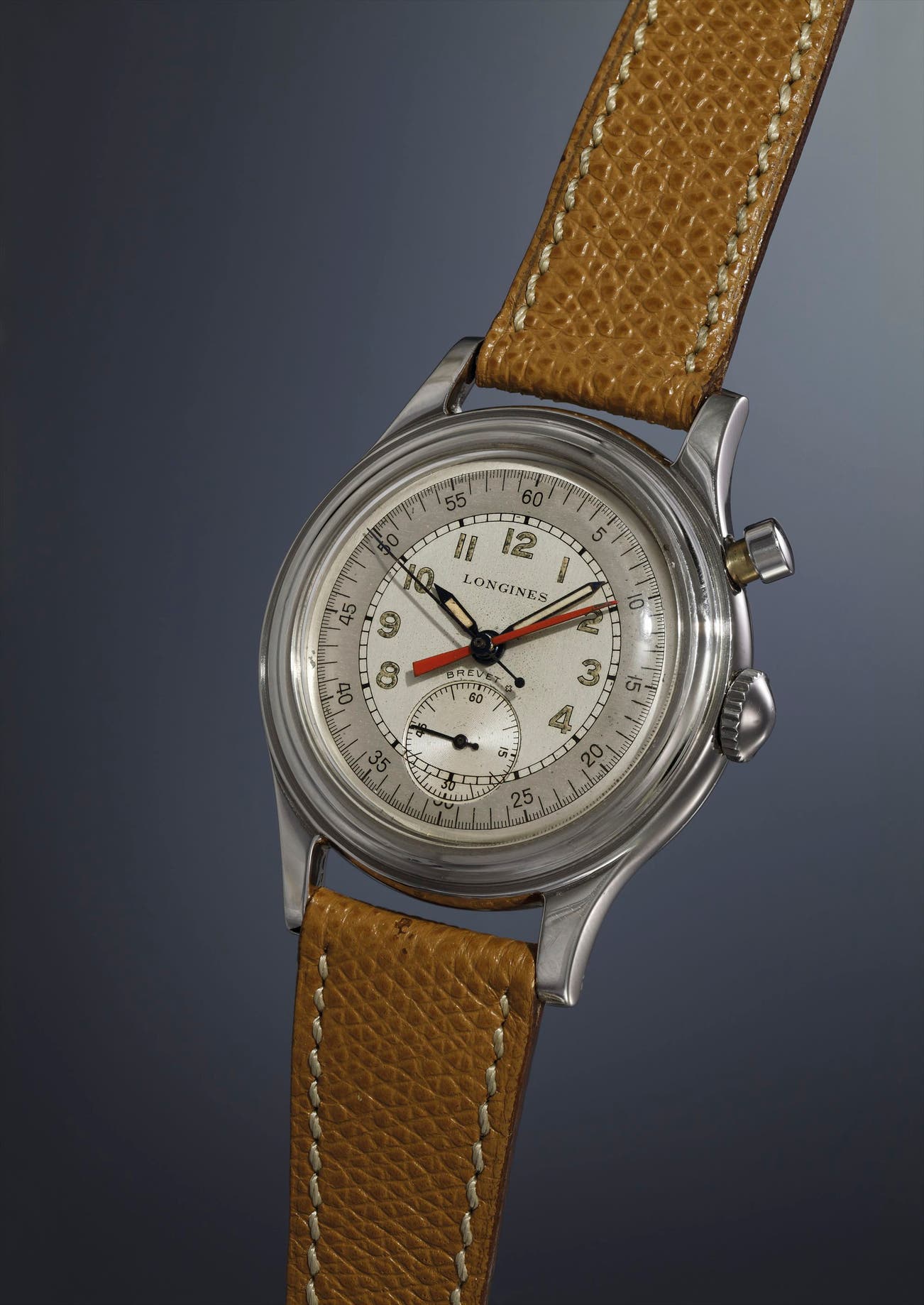 In addition to its excellent and very original state of preservation, this single-button chronograph impresses with its two-tone silvered matte dial and red center minute recorder hand. Whereas most chronographs have two subsidiary dials, this reference 5681 only features one. The result is greater legibility and better user friendliness. The largest variant of the model, its oversized “Brevet” (patented) case houses the Longines in-house fly-back caliber 12.68Z. So impressive is this particular watch, it is featured on two pages in John Goldberger’s book, “Longines Watches”.