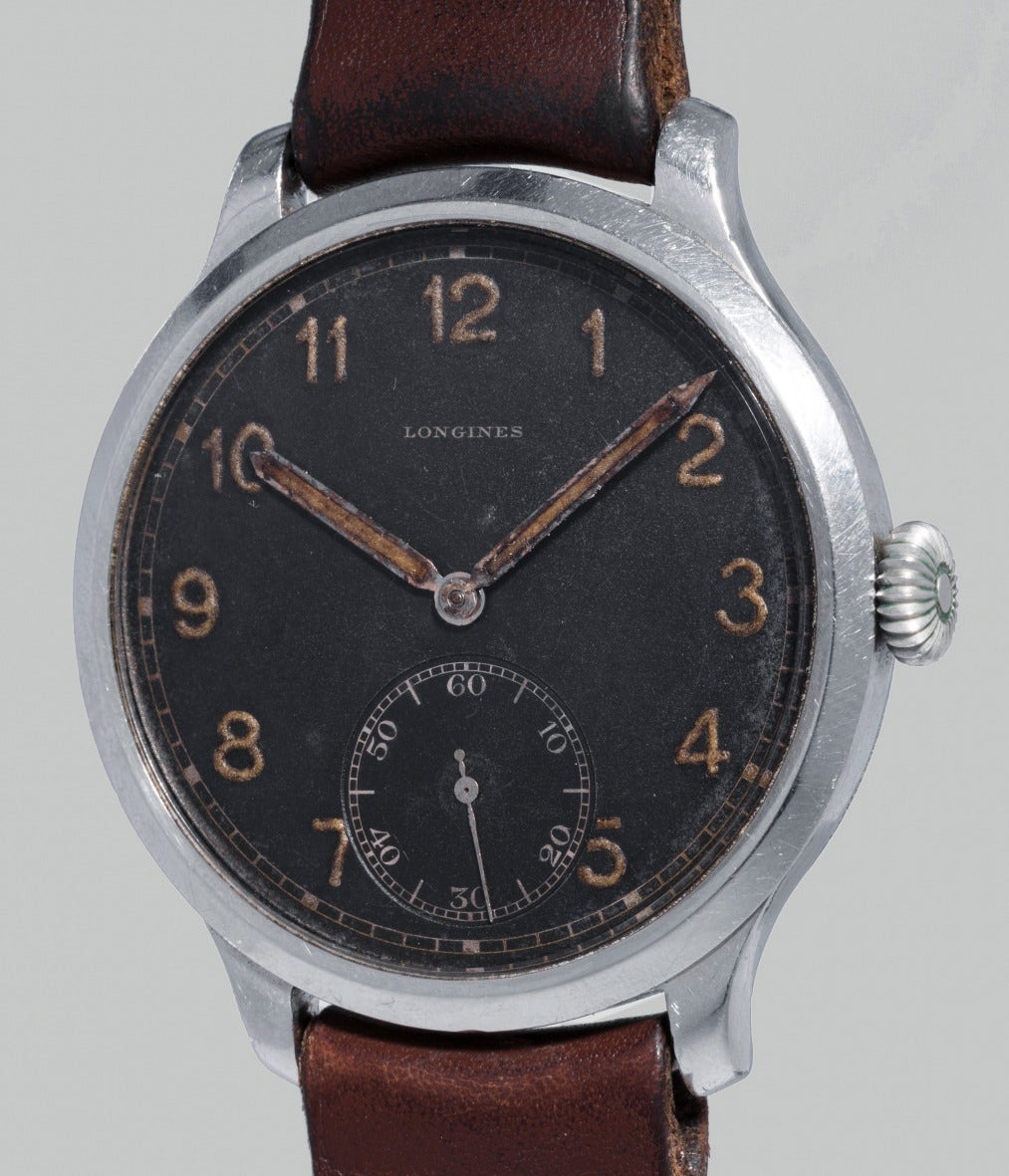 The present watch is offered today in a very appealing and original condition. For enthusiasts of military type watches, this Longines is an extremely rare treasure that is certain to delight and excite.