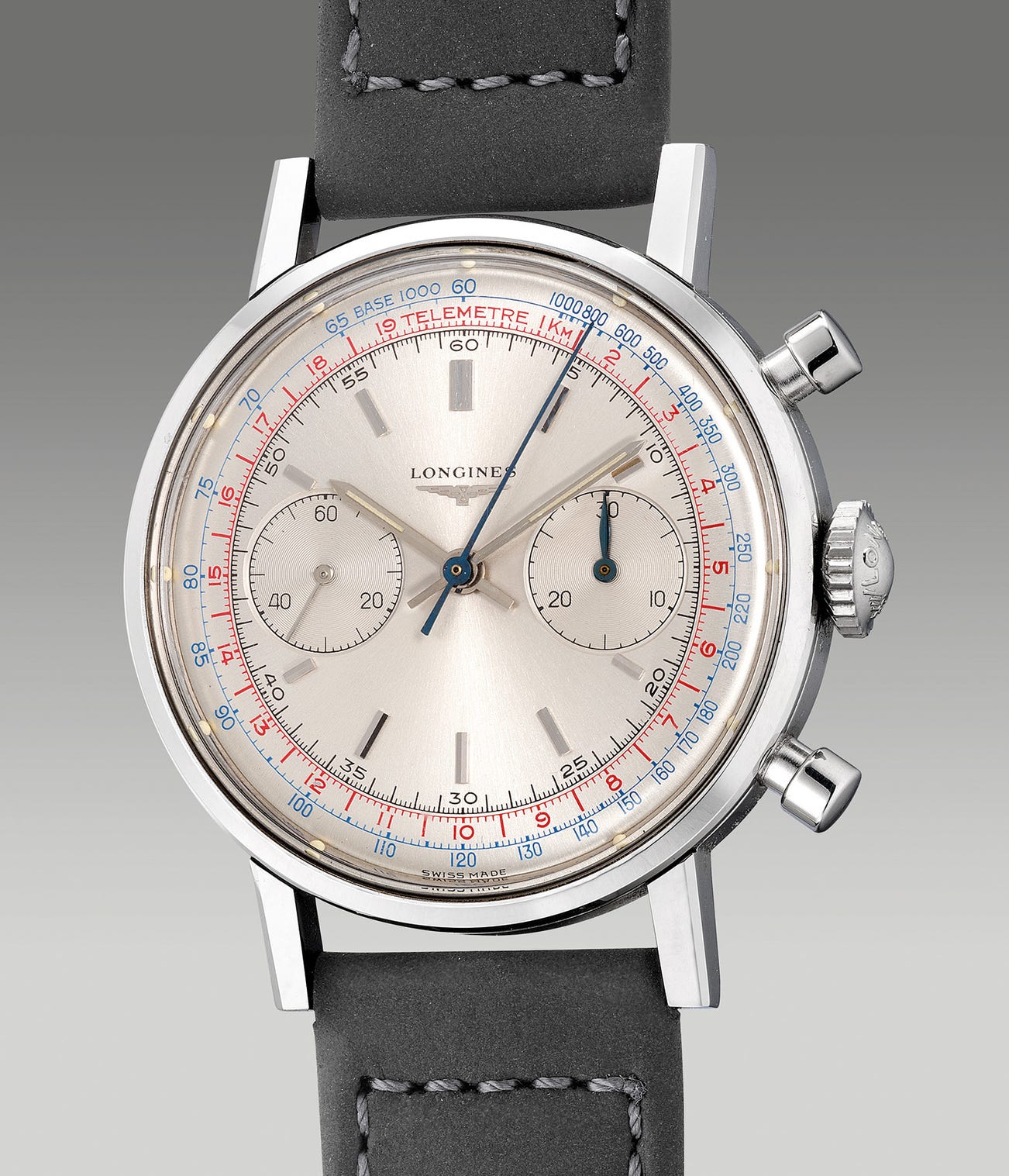 The present example is extremely well preserved and a lovely example of 1970s technology. The 38mm diameter case remains unpolished with sharp bevels to the lugs and facets to the lug underside. The rare silvered dial with multi-coloured scales, a red telemeter and blue tachymeter, is clean and original and enhanced by the central sunburst finish. Chronograph wristwatches are a collectors’ favourites due to their complicated movements, and with their history in the manufacture of flyback chronographs and classic masculine design, this Longines is a superb addition to any collection.