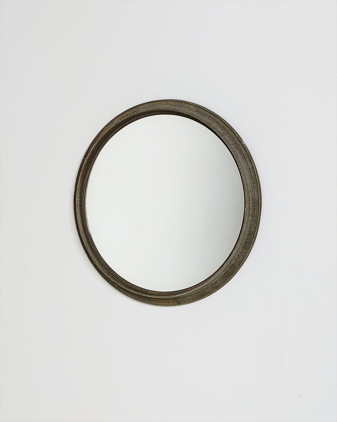 Patinated aluminum, mirrored glass.