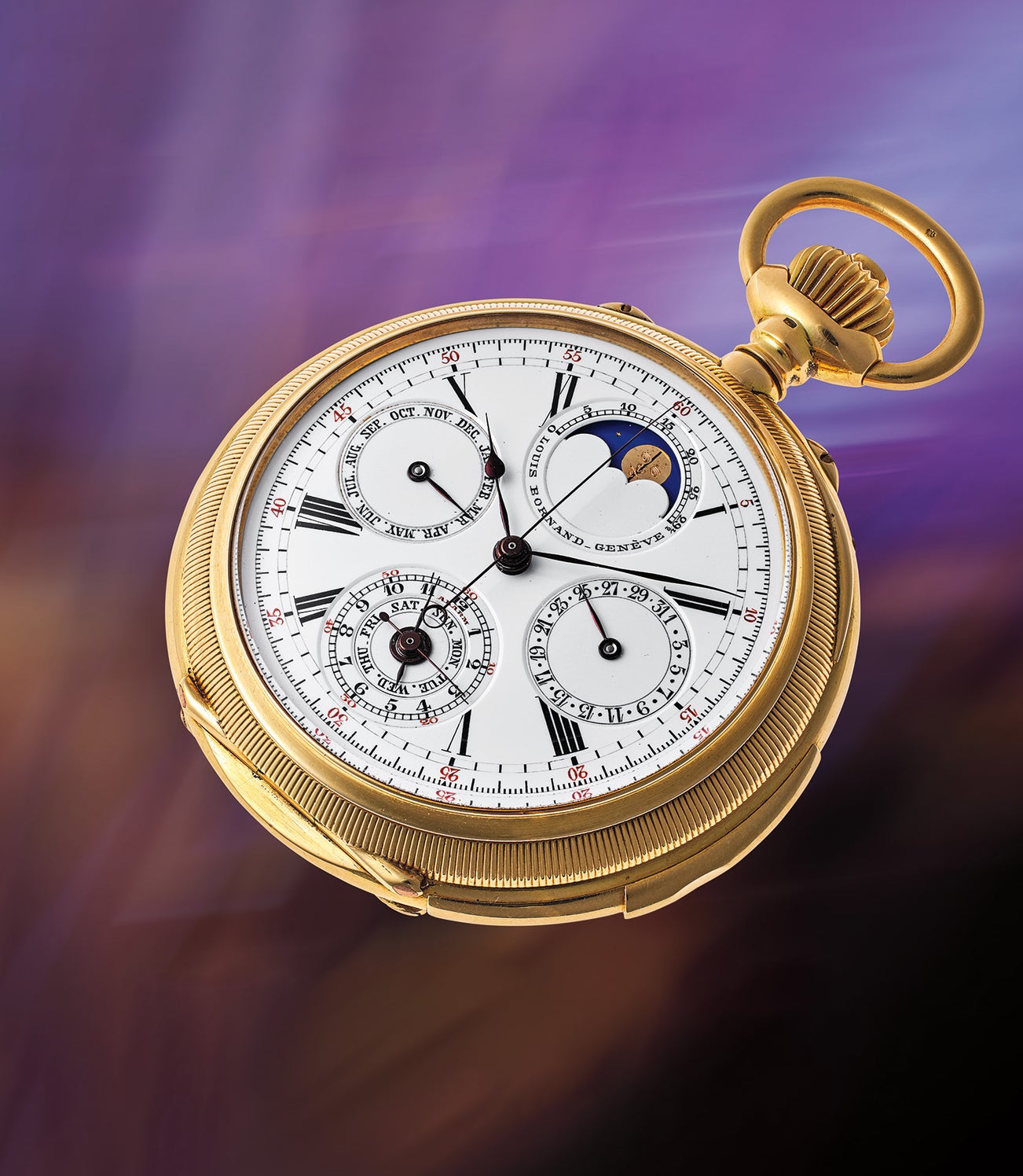 The present, highly complicated pocket watch is a tribute to the risking skill and craftsmanship of Swiss watchmaking in the late 19th century. Certainly a watch that could only have been afforded by a man of distinction, its extremely fine movement combines a perpetual calendar, chronograph, and a rare five-minute repeating mechanism, which chimes the hours followed by each of the elapsed five minutes since the hour. Exceptionally rare and hardly ever seen in pocket watches of this era, it also incorporates an alarm complication that strikes on gongs, a mechanism more often found on clocks of the time. Two gear trains are employed – one for the striking mechanism and the other for timekeeping, and another extremely rare feature illustrating the quality of this watch.