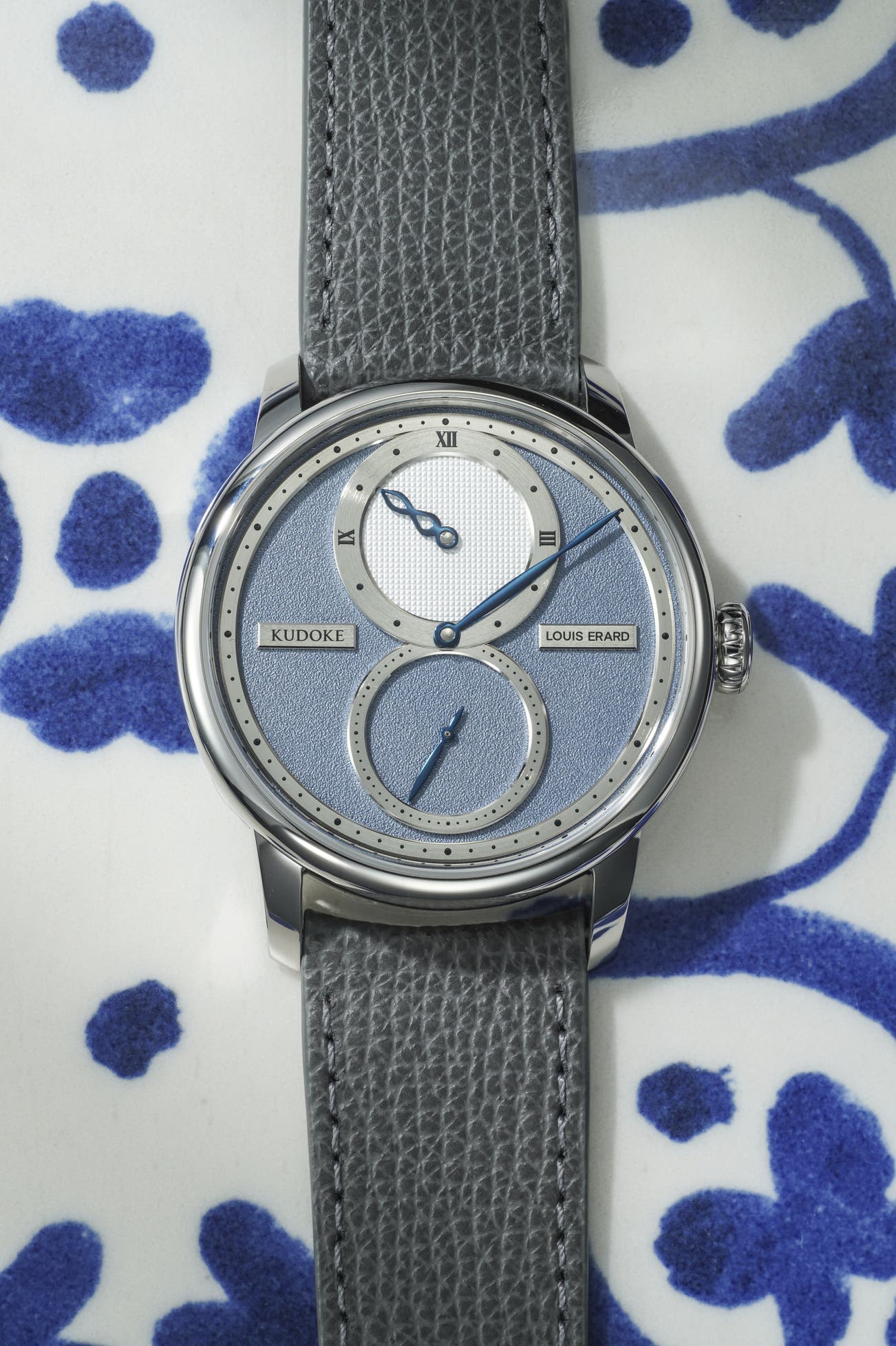 - The frosted dial surface, engraved textures, and heat-blued hands reflect Kudoke’s poetic design language and commitment to traditional handcraft.