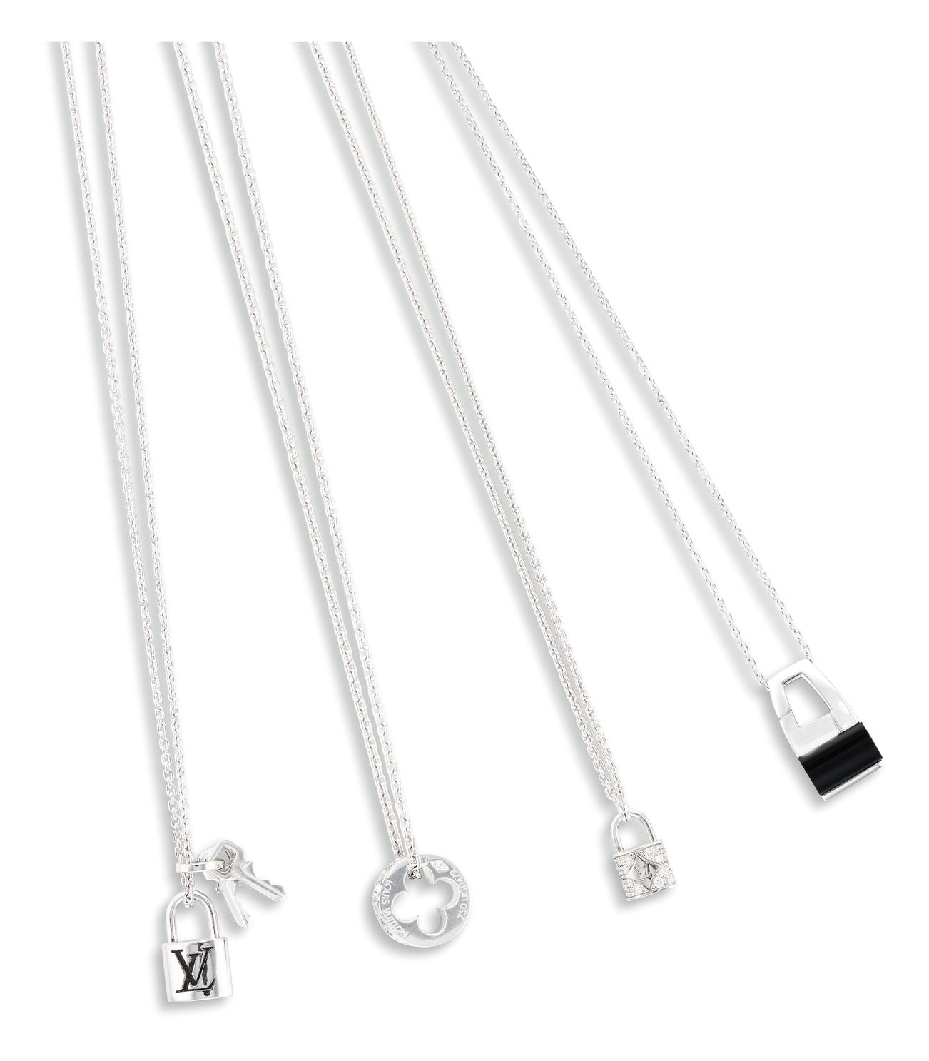Three pendants: a karat white gold padlock with keys, and a diamond-set monogram, a diamond-set padlockAll signed <em>LV </em>for <em>Louis Vuitton</em>, numbered<em> 387380, UGD472 and 416657</em> respectivelyOne pendant: curved onyx plaque, signed <em>LANVIN </em>Two Louis Vuitton pendants with French assay marks<em>With three Louis Vuitton signed boxes </em>All in 18 karat white gold