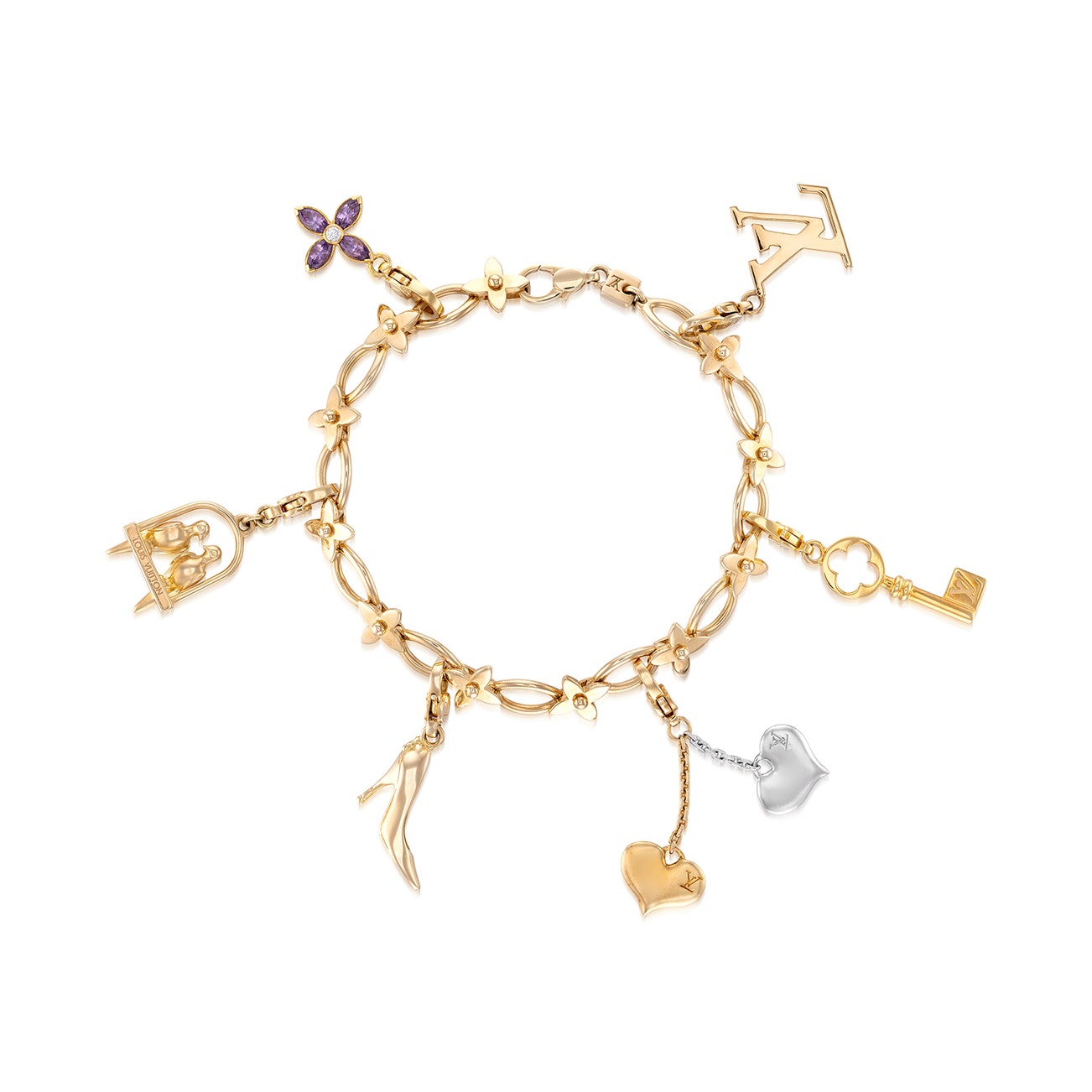 The bracelet suspending six detachable charms, including an amethyst and diamond-set flower, a pair of bi-coloured hearts, a high heel, a pair of birds, a key and a LV symbol, mounted in yellow and white gold, bracelet and charms all signed LV for Louis Vuitton, numbered, French assay marks, bracelet length approximately 155 mm, pouch stamped Louis Vuitton.