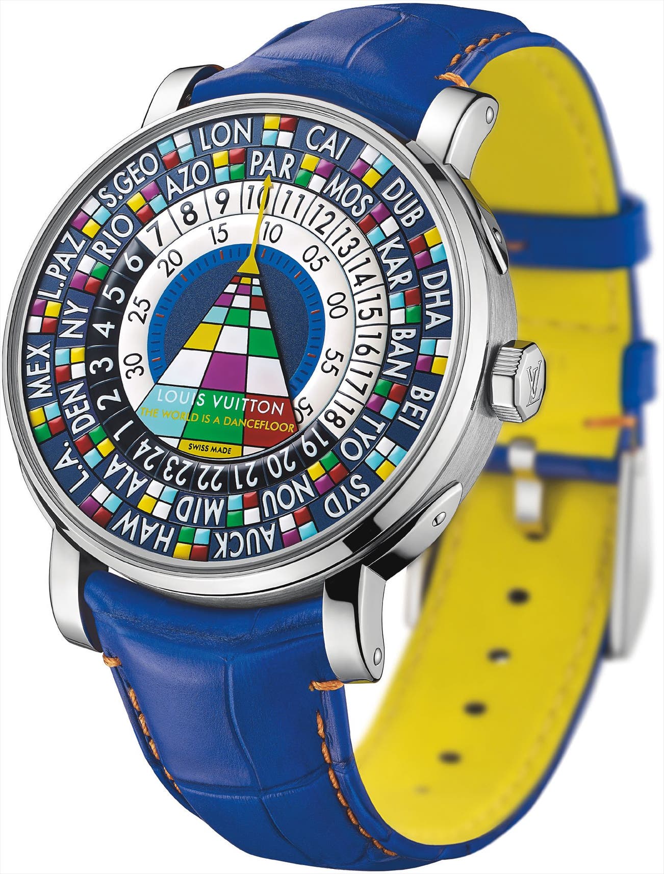 Louis Vuitton Escale Worldtime watch. Boasting bright shades applied according to a miniature painting technique, its dial is a call to travel. To know what time it is anywhere, La Fabrique du Temps Louis Vuitton devised and created a unique “Worldtime” feature. The Escale watch shows the world time without using a single hand. Time in 24 time zones is shown by three different mobile discs. For this 2015 edition, Paul was inspired by the colourful universe of the Escale Worldtime watch and decided to play with coloured squares creating a dancefloor pattern. The phrase “The world is a dancefloor” perfectly echoes the design and the function of the watch.
