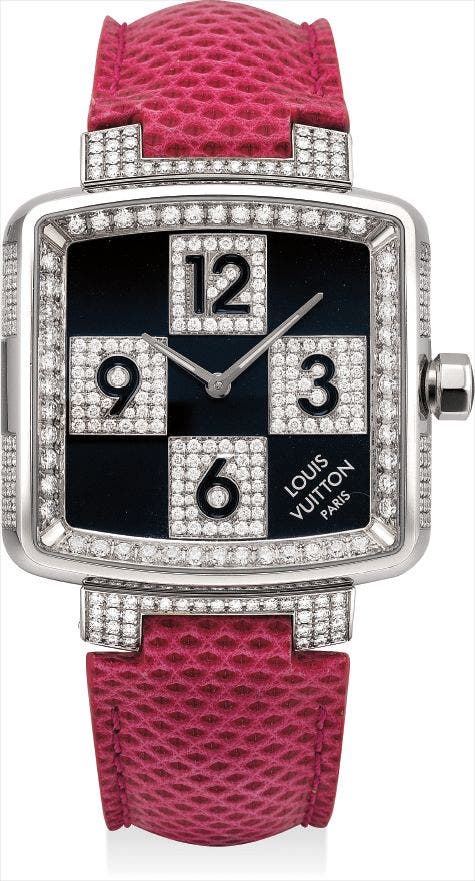 This elegant watch makes a strong fashion statement and features a diamond-set dial decorated with Louis Vuitton's signature Damier pattern. Illuminated with a pink crocodile leather strap, the present watch is lavishly set with 341 diamonds weighing approximately 2.47 carats. The band and lug is further adorned with pavé-set diamonds, adding a touch of chic to any outfit.