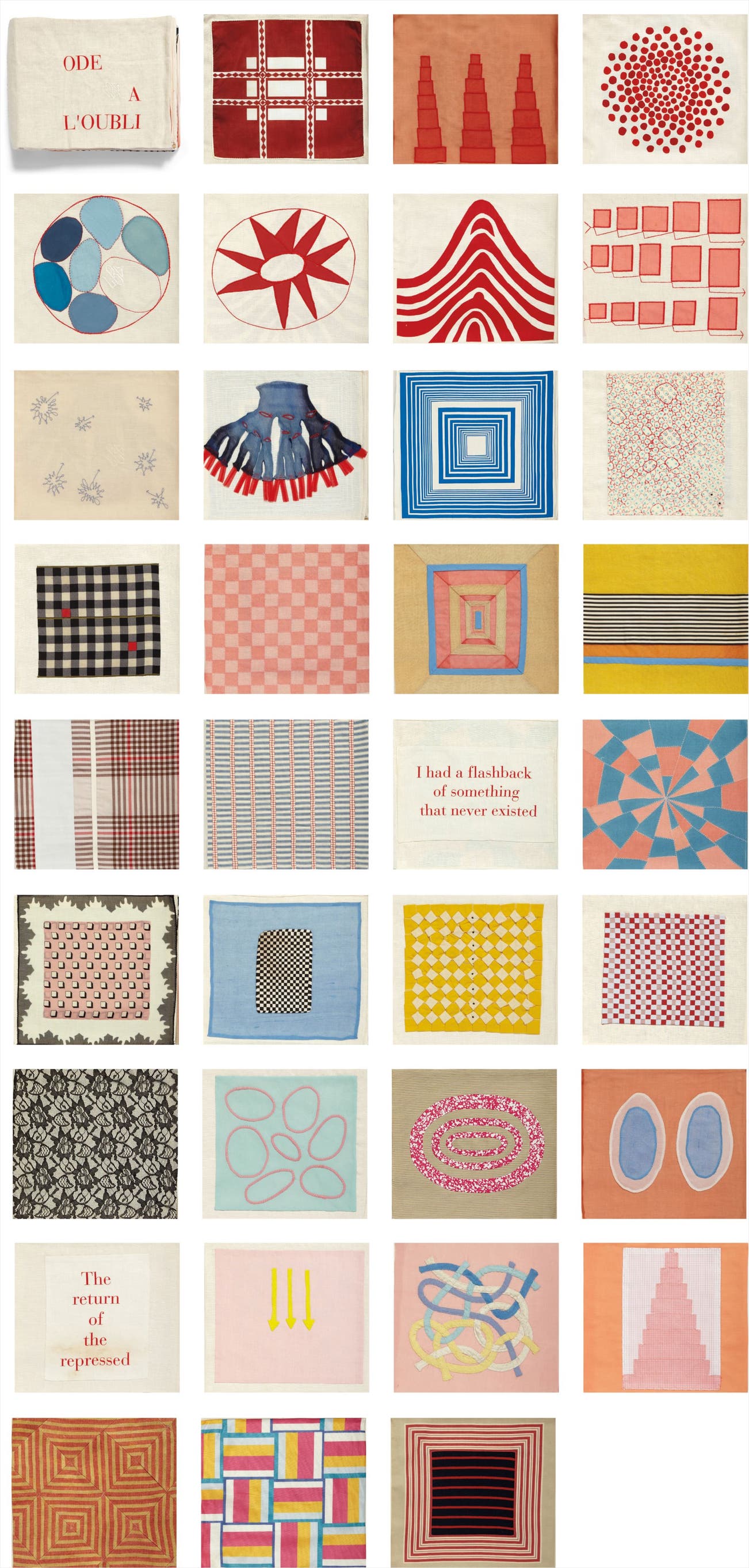 The complete hand-made cloth book with 35 compositions: 30 fabric collages with archival dyes and 5 lithographs on fabric, bound with tie and buttonhole fastening (allowing the pages to be unbound).