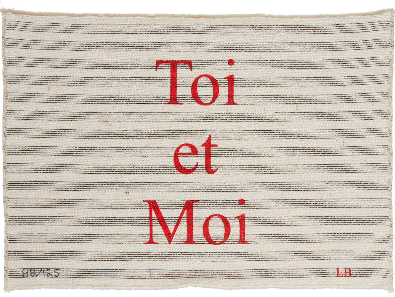 Screenprint in black and red, on woven fabric.