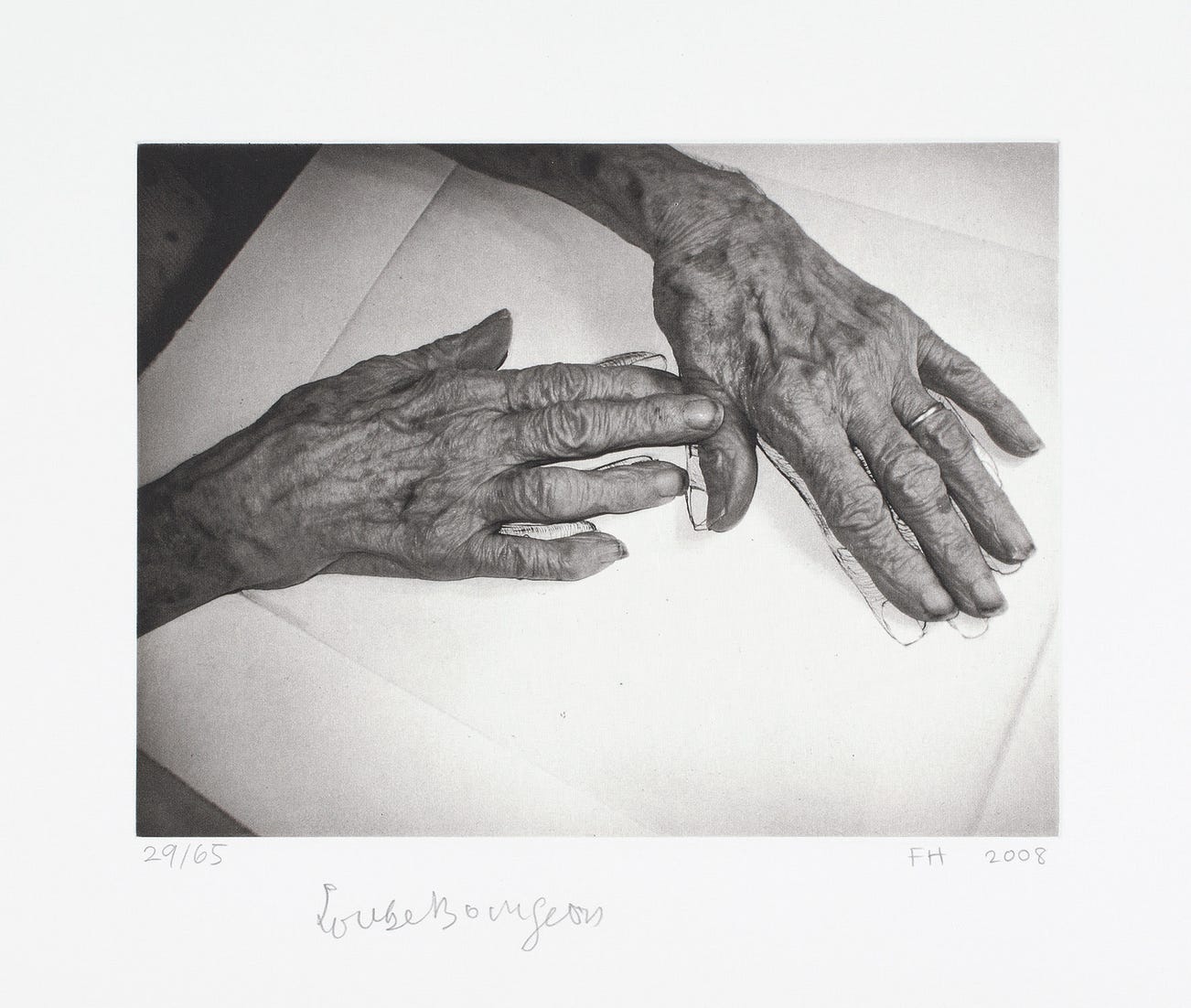 Bourgeois was a prolific printmaker, draftsman, sculptor and painter. She employed diverse materials including metal, fabric, wood, plaster, paper and paint in a range of scale — both monumental and intimate. She used recurring themes and subjects (animals, insects, architecture, the figure, text and abstraction) as form and metaphor to explore the fragility of relationships and the human body. Her artworks are meditations of emotional states: loneliness, jealousy, pride, anger, fear, love and longing.