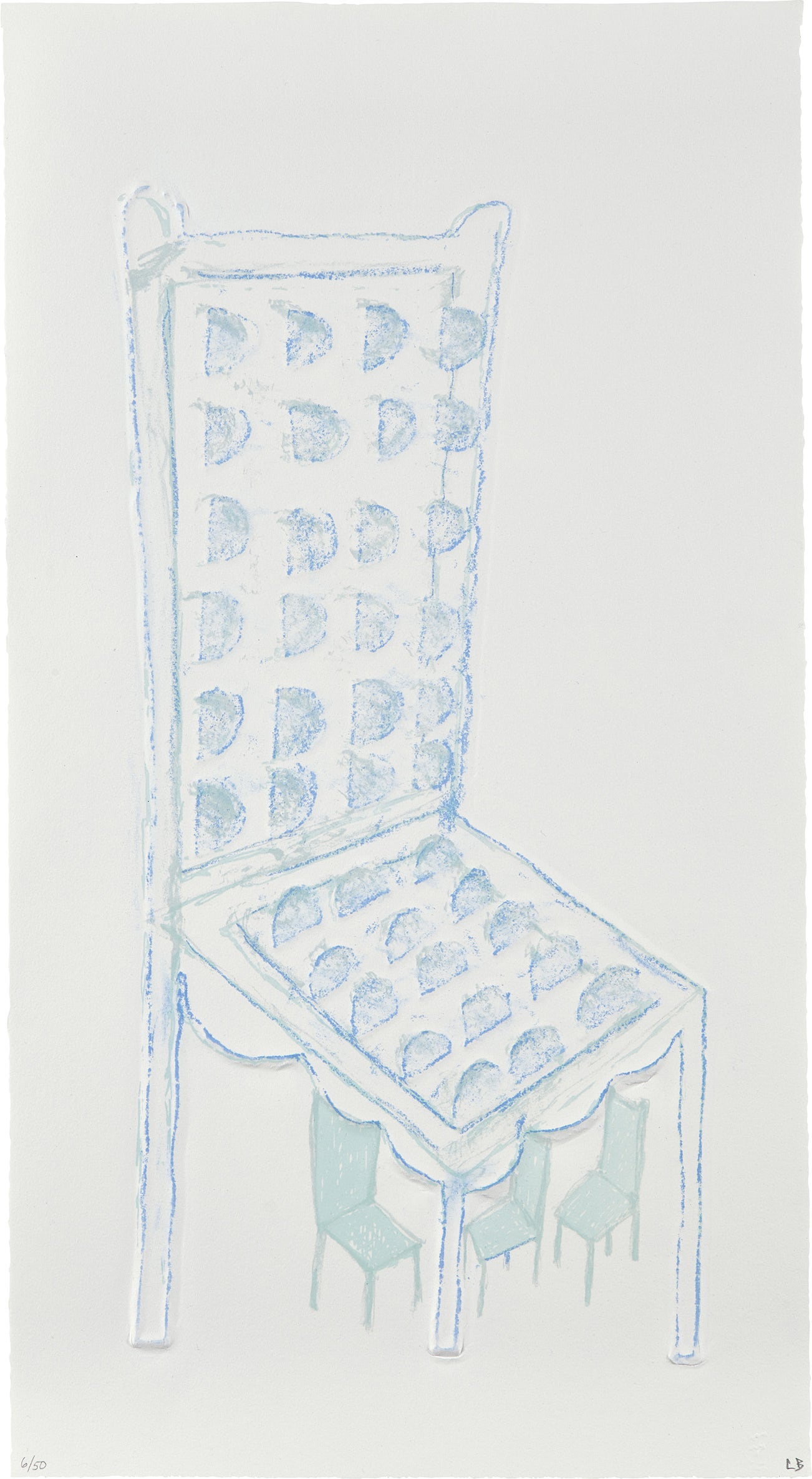 Lithograph and embossing with hand-coloring, on Rives BFK paper, with full margins.