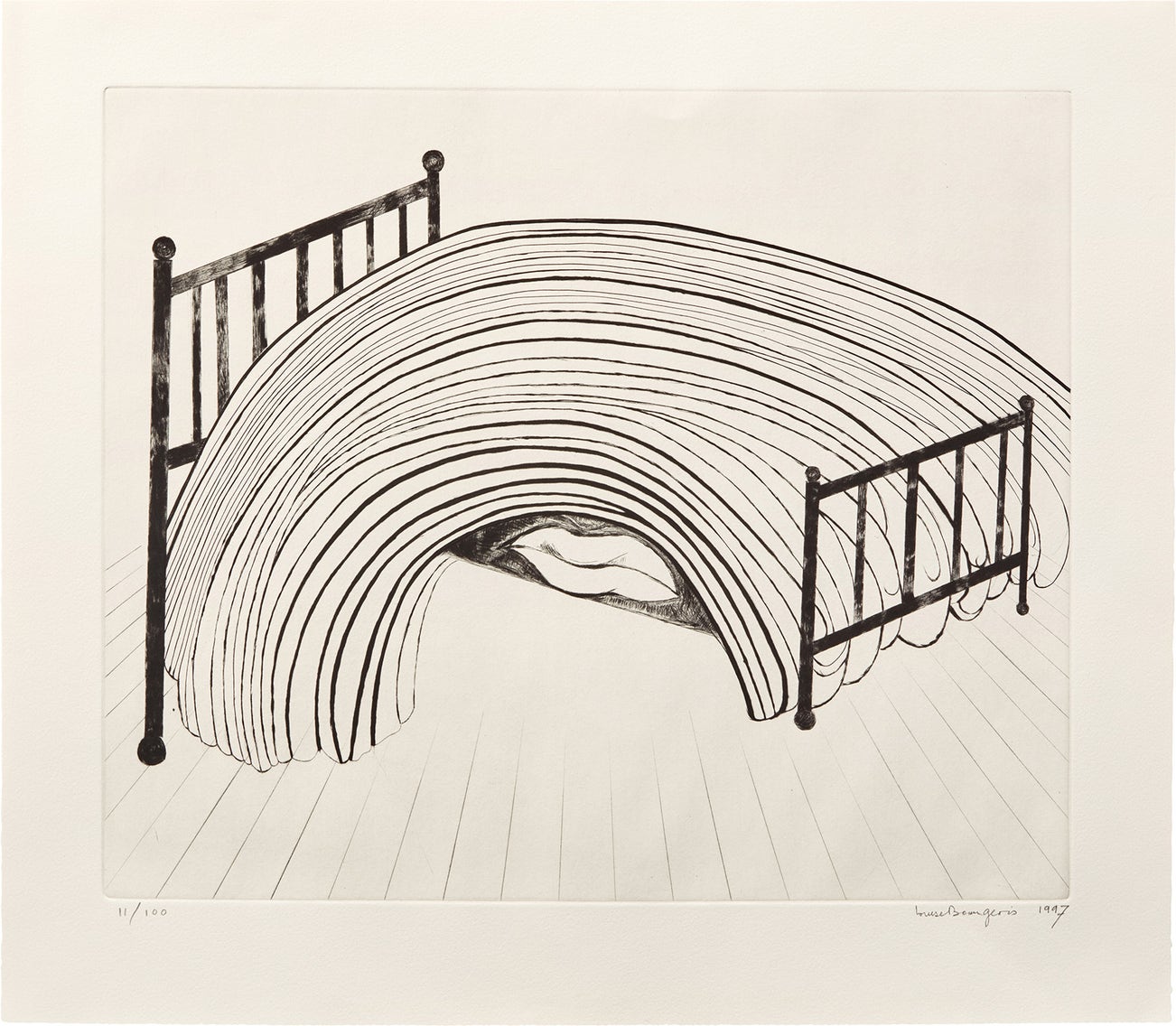 Bourgeois was a prolific printmaker, draftsman, sculptor and painter. She employed diverse materials including metal, fabric, wood, plaster, paper and paint in a range of scale — both monumental and intimate. She used recurring themes and subjects (animals, insects, architecture, the figure, text and abstraction) as form and metaphor to explore the fragility of relationships and the human body. Her artworks are meditations of emotional states: loneliness, jealousy, pride, anger, fear, love and longing.