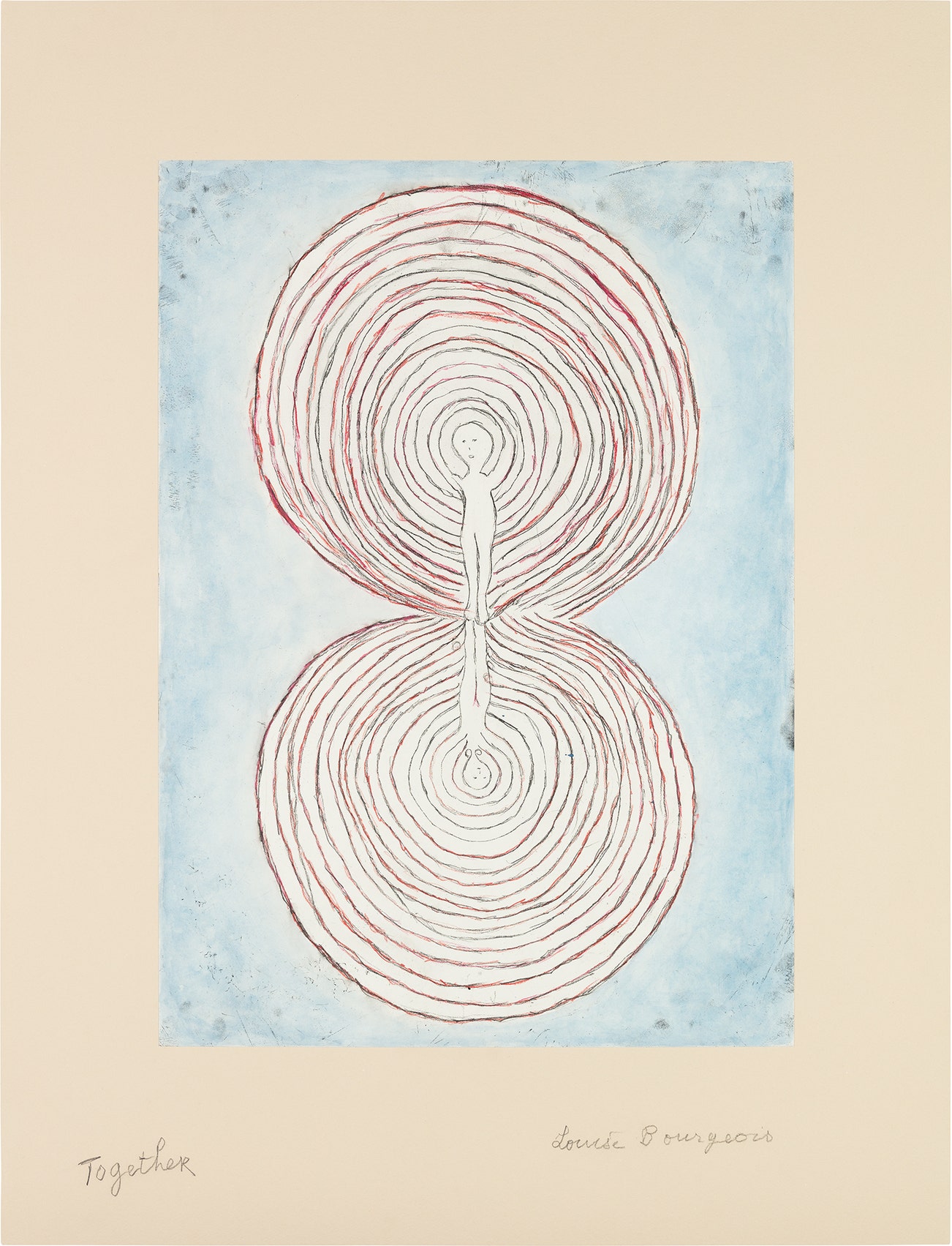 Bourgeois was a prolific printmaker, draftsman, sculptor and painter. She employed diverse materials including metal, fabric, wood, plaster, paper and paint in a range of scale — both monumental and intimate. She used recurring themes and subjects (animals, insects, architecture, the figure, text and abstraction) as form and metaphor to explore the fragility of relationships and the human body. Her artworks are meditations of emotional states: loneliness, jealousy, pride, anger, fear, love and longing.