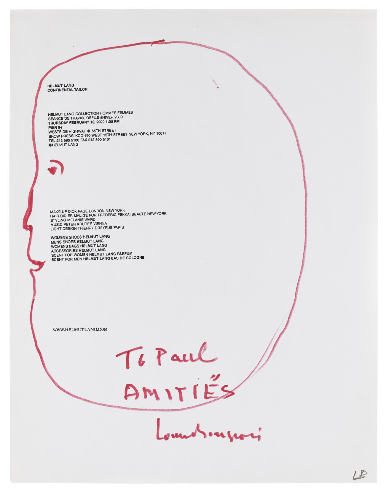 Unique red ink drawing, on wove paper Helmut Lang fashion show program.