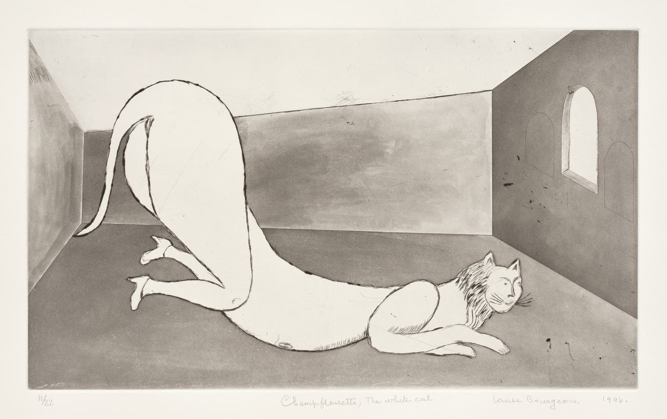 Bourgeois was a prolific printmaker, draftsman, sculptor and painter. She employed diverse materials including metal, fabric, wood, plaster, paper and paint in a range of scale — both monumental and intimate. She used recurring themes and subjects (animals, insects, architecture, the figure, text and abstraction) as form and metaphor to explore the fragility of relationships and the human body. Her artworks are meditations of emotional states: loneliness, jealousy, pride, anger, fear, love and longing.
