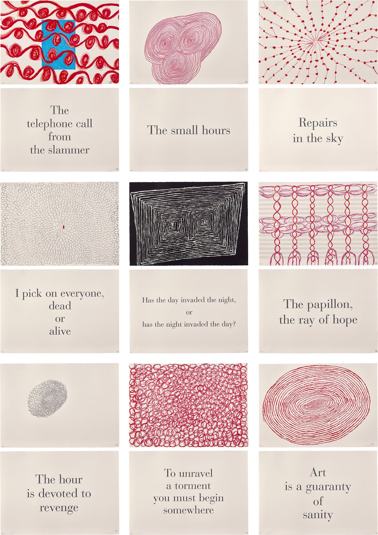 The text in this series was taken from Bourgeois's diary entries, spanning some forty years. The images are based on drawings created in the 1990s. Printer Judith Solodkin of SOLO Impression made photo-enlargements of the drawings and transferred them to letterpress plates.