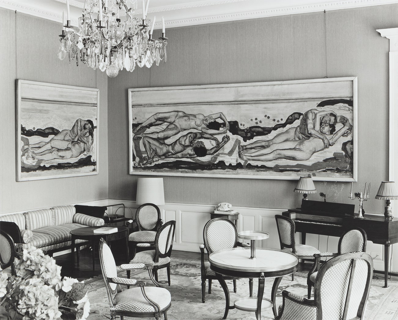 Untitled (Salon Hodler) depicts a stately parlor containing two lively, romantic paintings by nineteenth-century practitioner, Ferdinand Hodler. By contrasting the austere setting with the fervent eroticism of the renderings, Lawler’s photograph ruminates on how specific contexts transform the meaning of an artwork. Lawler has revisited this image multiple times in her career, producing it as a gelatin silver print (as seen in the present lot); a large format color print; a silver dye bleach print displayed beneath a paperweight; and a traced wall installation that is in the collection of the Whitney Museum of American Art.