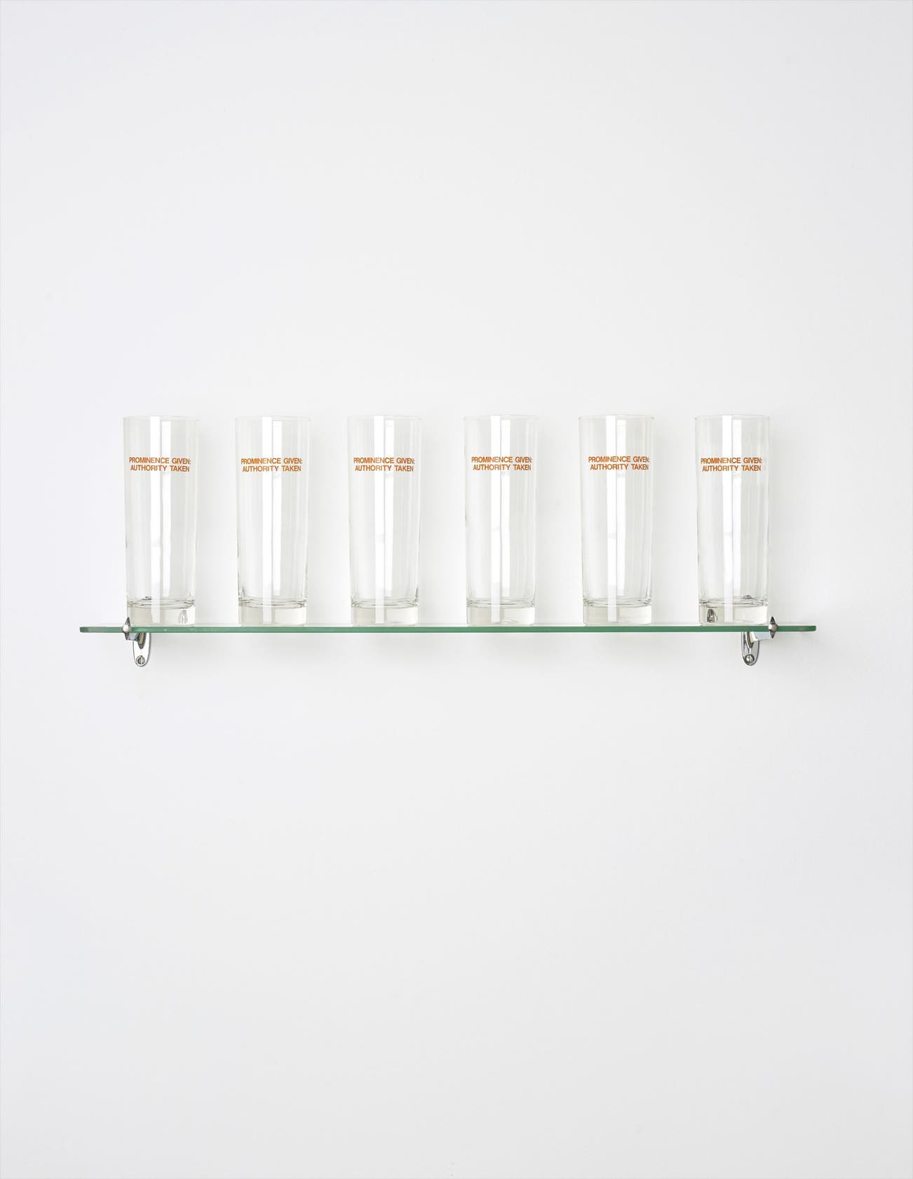 6 glass beakers with screenprinted text, glass shelf, metal brackets and fixings