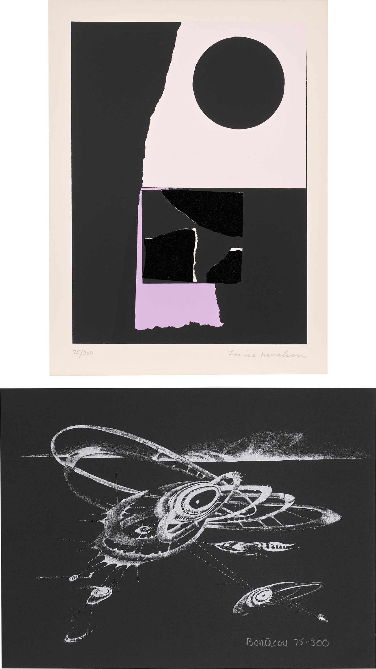 Both signed and numbered 75/300 in pencil (there were also 25 artist's proofs for the Nevelson), with the artists' copyright inkstamps on the reverse, published by Experiments in Art and Technology, Inc., New York, both unframed.