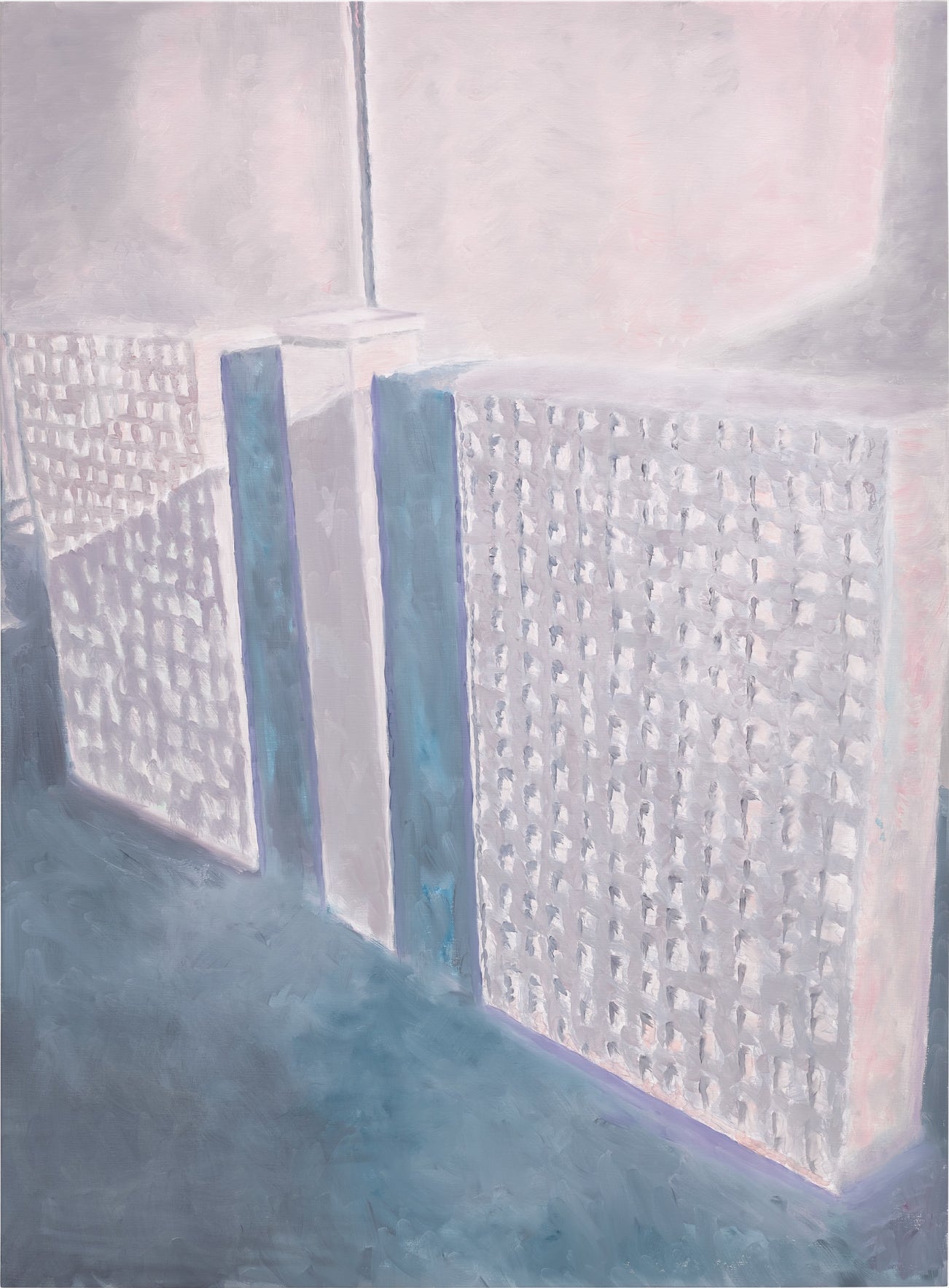 Quiet and subversively restrained, Luc Tuymans’ Model, 2012, is an exceptional painting that arose out of the artist’s ongoing dialogue with his close friend and acclaimed artist Kerry James Marshall. Tuymans’ coolly elliptical approach to the translation of mediated images here results in a dream-like vignette that belies the loaded motif it depicts, namely a now demolished public housing project once visible from Marshall’s Chicago studio. While this work is based on pre-existing imagery like all of Tuymans’ paintings, it takes a unique position for its basis on a specifically conceived architectural model kept in his studio. Employing a characteristically muted, white-washed color palette of delicate blues and violet, Tuymans daubs, brushes and feathers the paint with fleet brushstrokes across the canvas to create a diffused, almost impressionist rendering of this motif. Characteristic of Tuymans’ conceptual approach to addressing political issues with a remarkable subtlety and ambiguity, Model presents the viewer with a third-degree abstraction from reality where crisp architectural geometries have been rendered hazy and slightly out-of-focus, like a faded memory or an overexposed photograph.