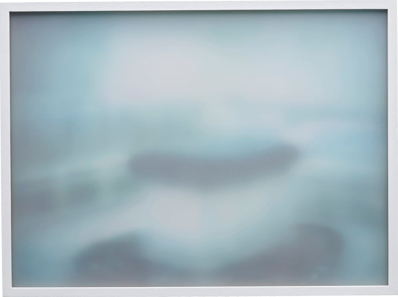 3D-collaged digital print in colours, behind sand blasted opaque Plexiglas, contained in a white painted wooden frame box.