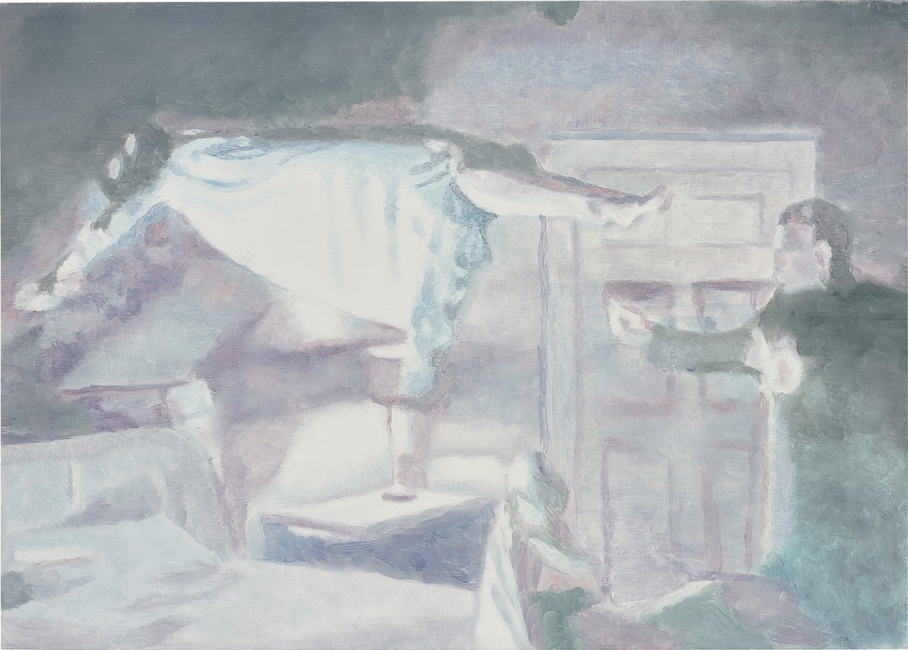 In Luc Tuymans’ The Exorcist, painted in 2007, a supine body is seen levitating over a vacant bed, controlled by the spiritual conviction of a priest raising his arms. Rendered with frosty hues of blue, purple and black, the composition is akin to a ghostly screen, oscillating between ethereal realism and eery fiction. Both mimetic and atmospheric, it encapsulates Luc Tuymans’ exquisite storytelling abilities in painting, most often informed by pre-existing narratives in photography, film and illustration. Existing amidst Tuymans’ narrative-driven body of work, The Exorcist draws its core image from the eponymous movie directed by William Friedkin in 1973, in which a young girl becomes inhabited by evil forces as she approaches puberty. Tuymans’ painterly reproduction, drawing from a specific exorcism scene from the film, posits as a thrice-removed simulacrum: it mimics Friedkin’s cinematic iteration, which itself was based on a best-selling novel inspired by true events. A copy of a copy of a copy, The Exorcist presents an imagistic appropriation exacerbated through additional degrees of separation.