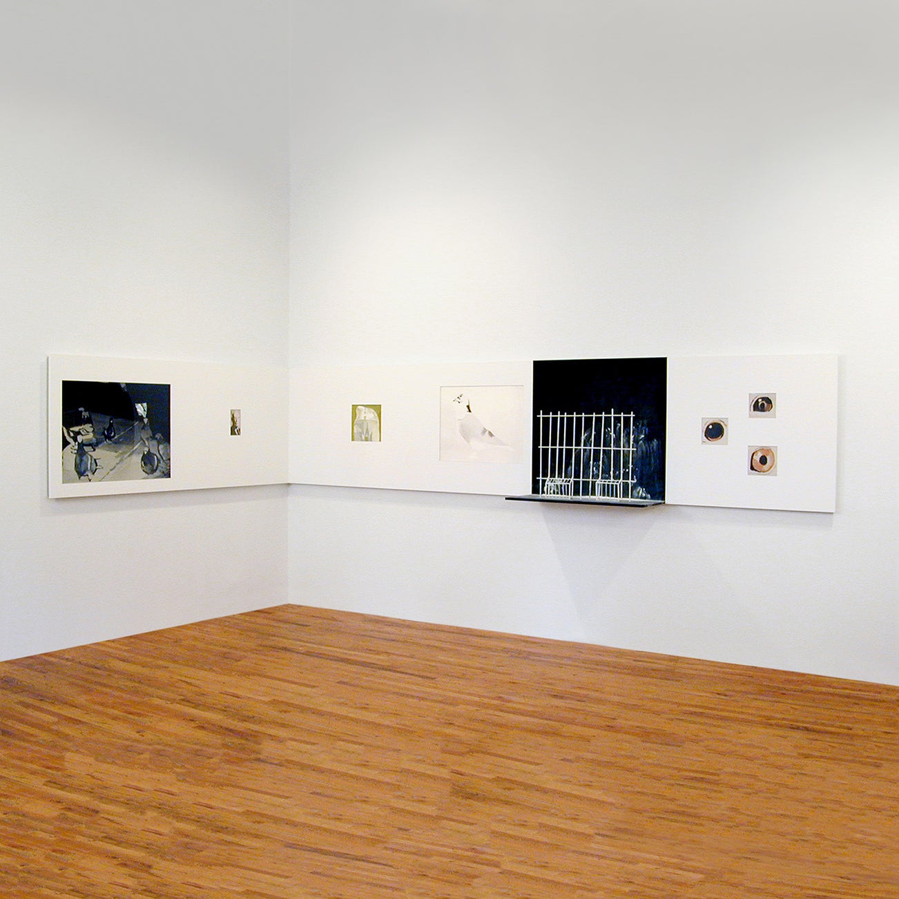 Installation suite of seven color lithographs mounted on three panels of painted plexiglas and wood, with birdcage, with accompanying custom crate and installation instructions.