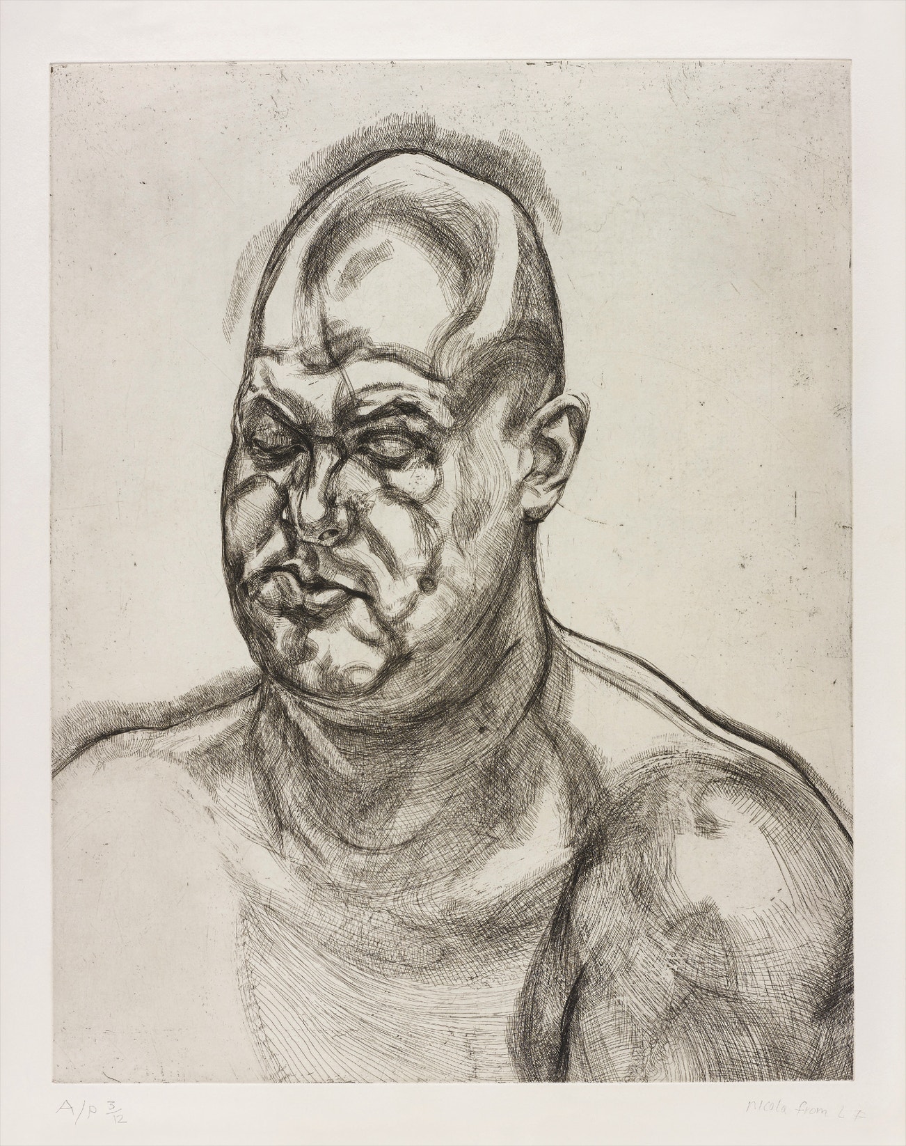 The group includes four etchings; two portraits of Leigh depicted in the monumental Large Head and tender Reclining Figure. Leigh also appears in the group portrait Four Figures with Cerith Wyn Evans and Freud’s daughter, Ib holding her own daughter. The fourth etching is a rare proof impression of Freud’s portrait of Bruce Bernard.