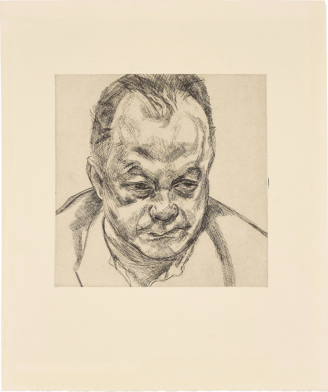 In his paintings, Freud's layers of impasto jabs of paint create a surprisingly delicate, translucent depiction of flesh, while his etchings employ an economy of line that implies the figure more than it illustrates it. Charismatic but irascible, Freud worked only from sitters that he knew, consistently focusing on translating his direct perceptions. The resulting portraits are redolent with a stark and evocative psychological intensity, underpinned by an unexpected tenderness towards the subject.