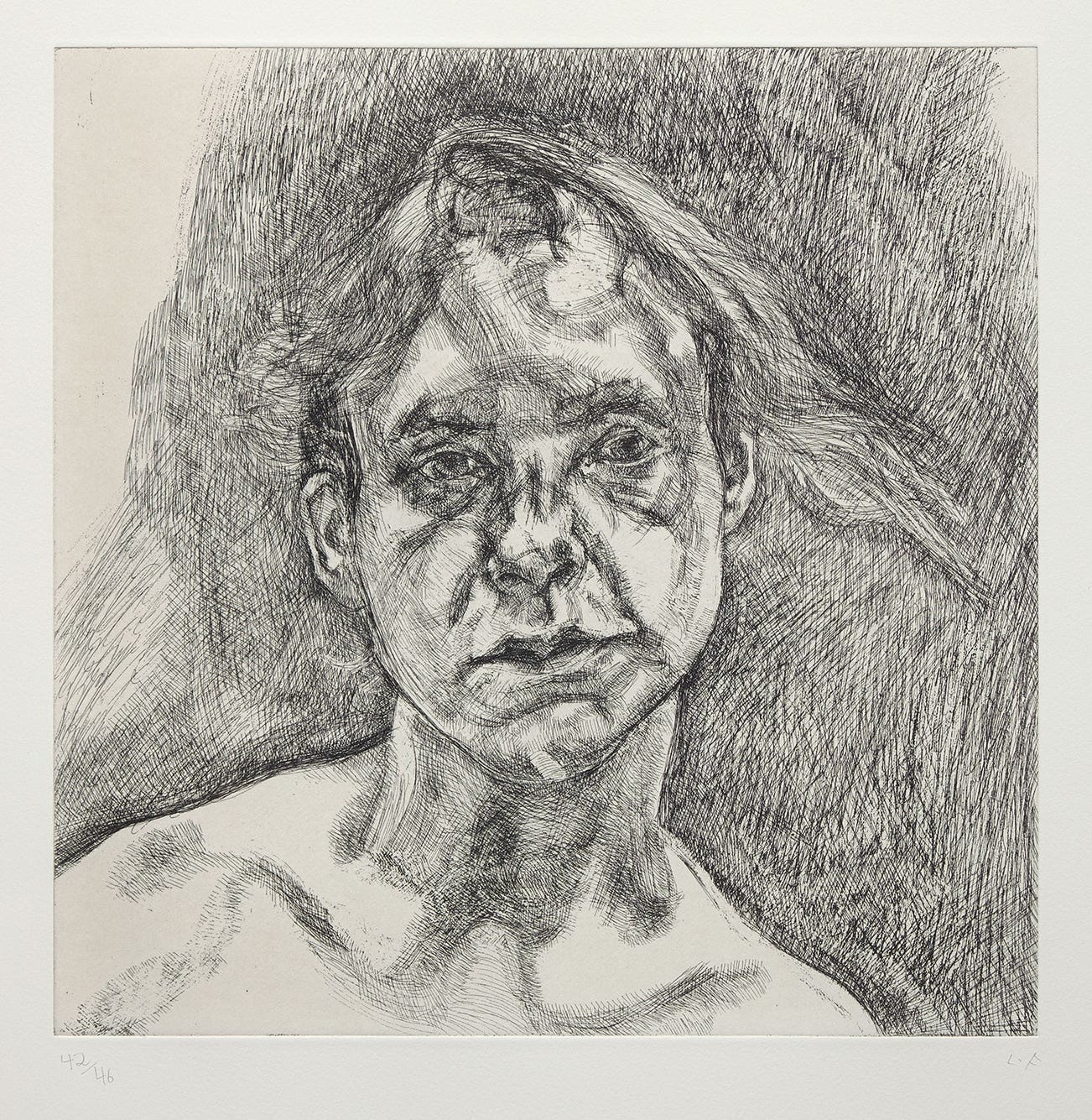 In his paintings, Freud's layers of impasto jabs of paint create a surprisingly delicate, translucent depiction of flesh, while his etchings employ an economy of line that implies the figure more than it illustrates it. Charismatic but irascible, Freud worked only from sitters that he knew, consistently focusing on translating his direct perceptions. The resulting portraits are redolent with a stark and evocative psychological intensity, underpinned by an unexpected tenderness towards the subject.